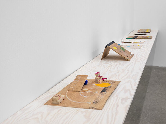 In the works on view—the paintings and PAARA, but also in a series of quasi-architectural models and sketchbooks placed on a shelf that lines one wall of the exhibition—Ghosh is studying the experience of a form that is not stable. The grid is there, the graphic sign is dutifully transcribed and transcribed again, and the task set forth by the forms Ghosh sketches in space with plywood and paper is attended to, every time. Despite this diligence, I leave his exhibition marked by the possibility that meaning is translucent. It strikes me that there are entire universes of sense that elude the sign, the form, and the drawing altogether, the reflections of which we call shadows in order to disavow the inadequacy of language.