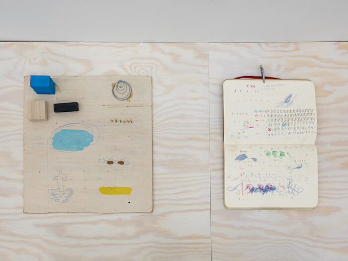 Paintings like Untitled (all works 2018), Glycerin, and Tennis Ball exhibit a subjective pattern, while they bring up references to systems of order and logic. All three paintings have a grid structure, through which objects move like musical notations. In Untitled, earth-toned flowers and colorful brushstrokes appear in circular motion, while Tennis Ball suggests some sort of schematic organization of evolving organic material in an uncertain relationship to the large blue circle from which the work derives its title. As is the case with many of Ghosh’s paintings, the painted objects seem bound or conjured by a logic viewers are not expected to decipher. A work like Trick in the tent, made up of white and red circular abstract scribbles on a black board, yields its dynamic composition exactly from this feeling that the formula is present but inaccessible. In another painting, Violet, Ghosh leaves a large purple field of color untouched, as an open suggestion of space for other possible scenarios for objects—in this case, parrots and an apple—and paint to come together. A table display running the length of one wall of the gallery includes small assemblages and the artist’s sketchbooks filled with drawings and personal notes on materials like mercury. Together they exemplify Ghosh’s interest in object ontology, and how objects might collapse or transform their state.