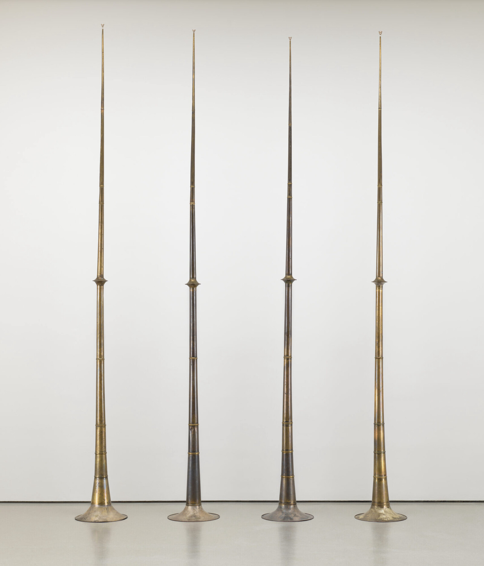 Terry Adkins’s Synapse (1992) hovers close to the ceiling, a yellow enamel-painted drum skin as perfectly rounded as the July sun. Beneath it is Adkins’s Last Trumpet (1995), a quartet of eighteen-foot-long horns crafted by attaching used trombone or sousaphone bells to brass cones. Standing like the enduring towers of an ancient civilization, the musical instrument-cum-sculpture resonates with the potential of its own activation (Adkins would play the instrument from its first presentation in 1996 through to his passing in 2014).