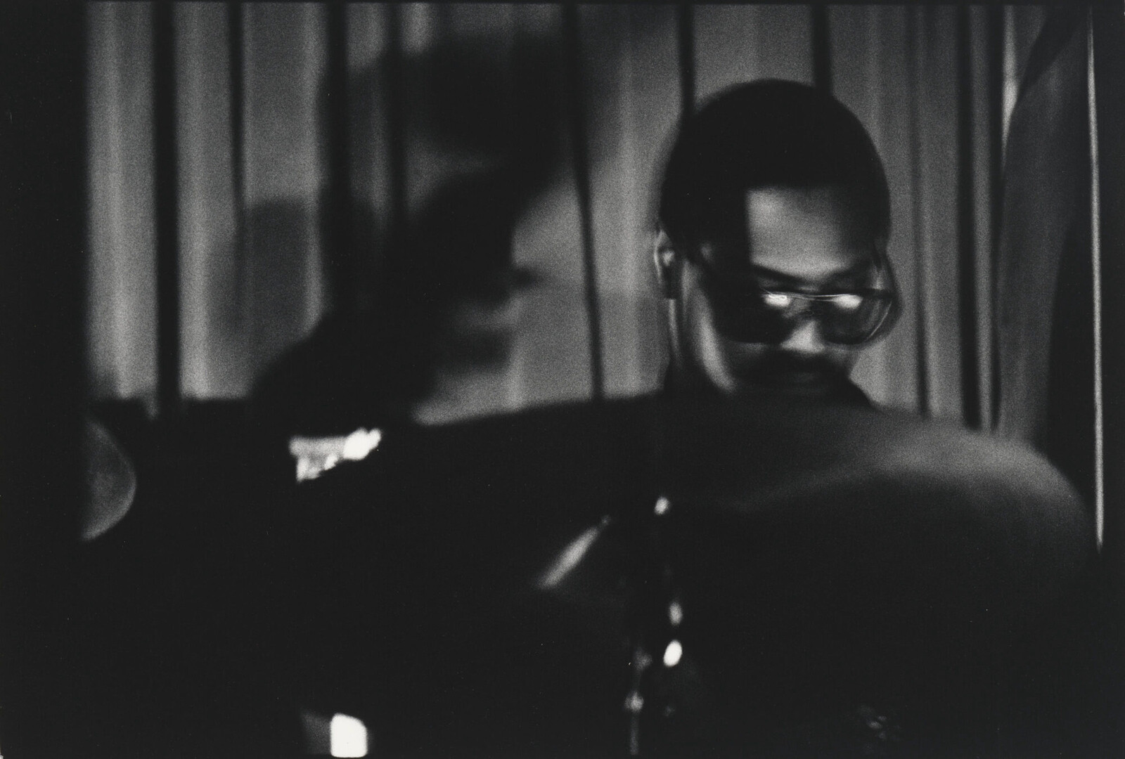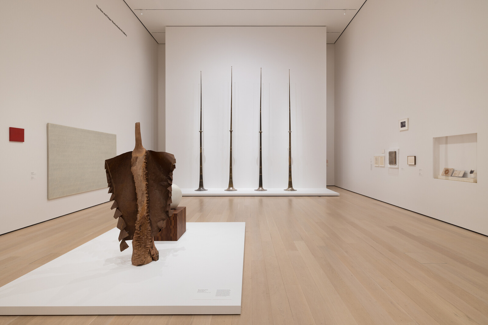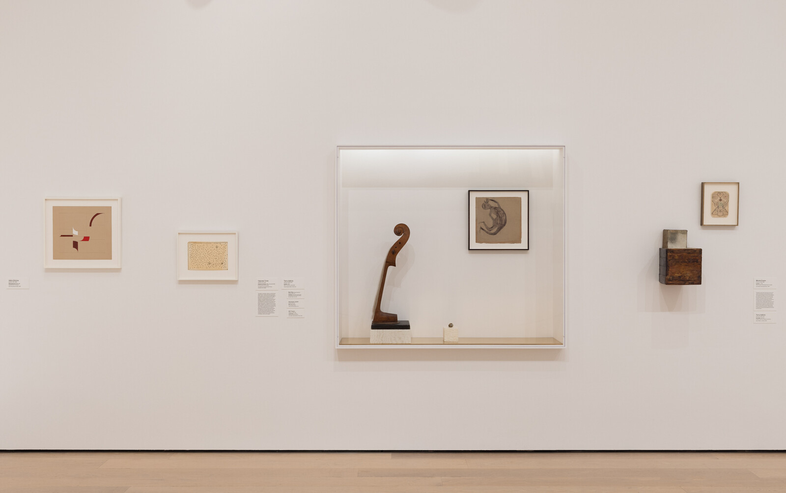 In Lucas Samaras’s Book 4 (1962), an open book is encrusted with countless sharp pins, scissors protruding from torn pages. This monstrous transformation of an everyday object rests harmlessly behind a glass vitrine. It is not sound that is suggested by this work, but rather the sensation of touch (which is not itself distant from music, a material phenomenon we associate with rubbing or tapping or plucking). Hélio Oiticica’s gouache-and-ink drawing Metaesquema No. 179 (1956) recalls the traces of a violinist or a conductor’s abrupt gestures, a handful of generously rounded but determinedly economic forms occupying a gently drawn geometric pattern. Where Oiticica suggests an absent body, Jean Arp and Moustapha Dimé summon the corporeal likeness. Arp’s bulbous stone figure (Human Concretion, 1935) sits centerstage, adjacent to Dimé’s Lady with a Long Neck (1992), a re-imagining of the female body in wood, iron, and paint. Against the former’s curled-up physique, the latter stands tall with its solid tree trunk core (sourced from Dimé’s native Dakar) and two winglike iron arms spread open.