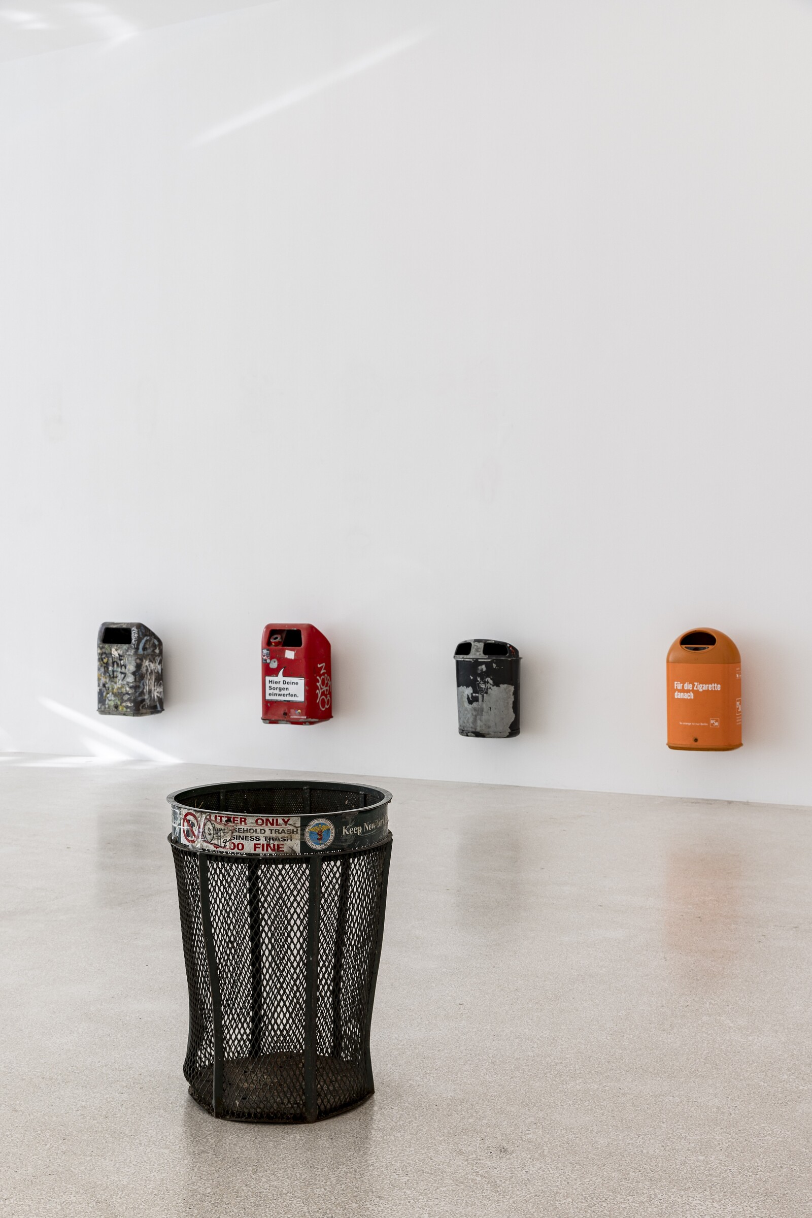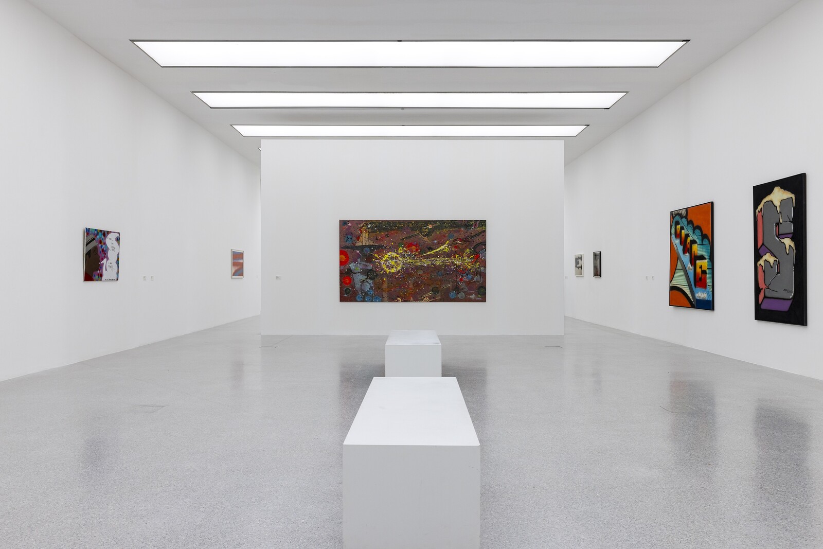 The influence of such artists living and working on the Lower East Side upon the art market in the 1980s is perhaps most clearly encapsulated in the collaborations between Jenny Holzer and Lady Pink, and Martin Wong and LA2. Further questions of authorship—a recurrent theme in graffiti culture, where pseudonyms and collective tags operate as signals of allegiance—put the post-conceptual practices of Michael Krebber, Heike-Karin Föll, and Karin Sander under subtle pressure. Shown together along a corridor, their minimal use of spray paint, an often-breathless amount of black paint onto white canvas, breezily collapse the axis between authorial identity and currencies of artistic expression. The works also hold a surprising curatorial spur, staging the financialized and conceptual distance between the street and the gallery, where margin and center appear as alien life forms to one another.