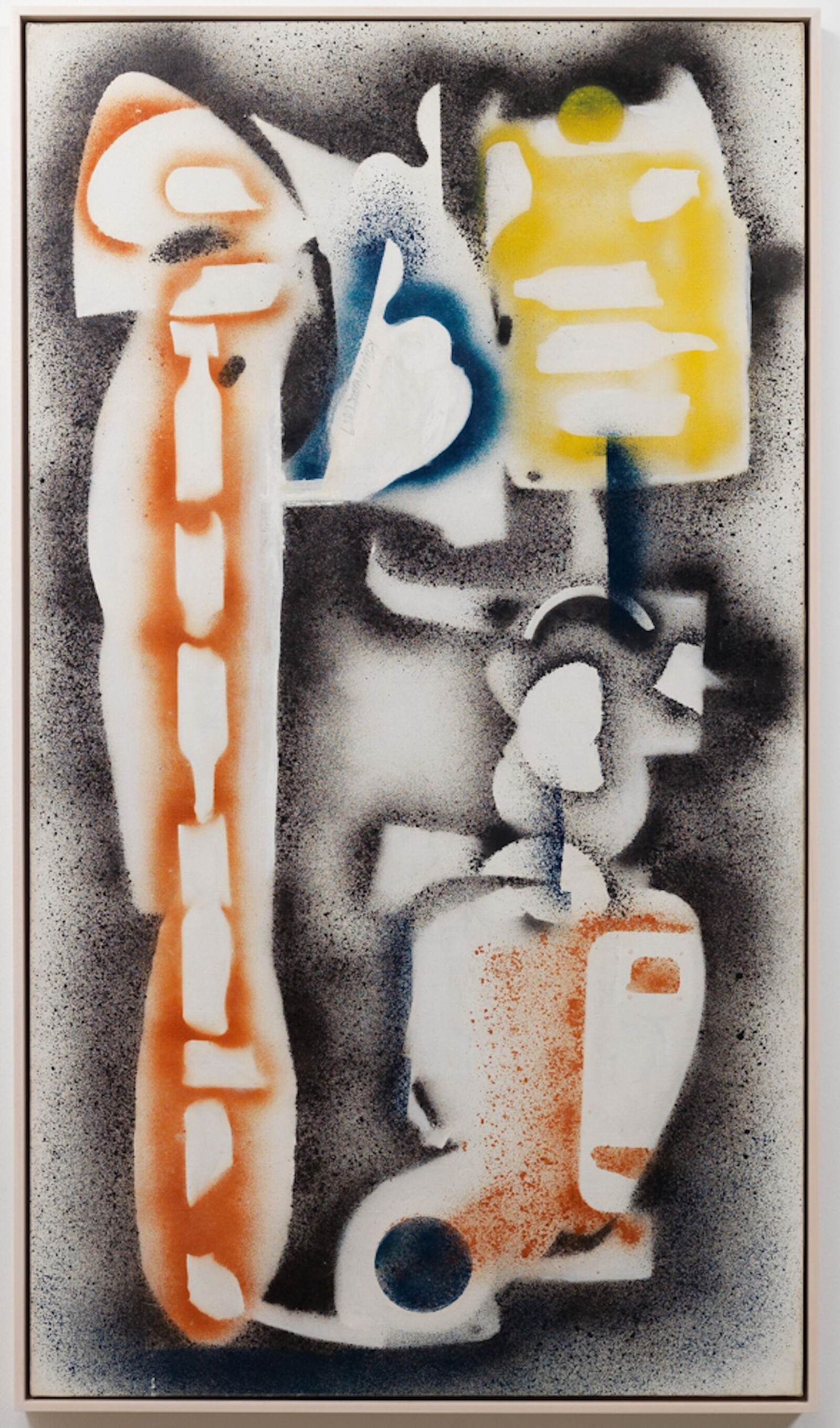 The exhibition also obliquely draws parallels to the 1959 development of the telephoto lens for the 35mm camera. The capacity of this lens to zoom, distort, and destabilize spatial orientation mirrors the layered, often vertiginous composition of the city itself. The works of Sterne, but also David Smith and Melvin Edwards’s sprayed and splattered negative of chains from 1974, all latently use the mechanical propulsion of paint to produce a clear photographic indexicality of an object but to also apply a deep focus-like range through superimpositions.