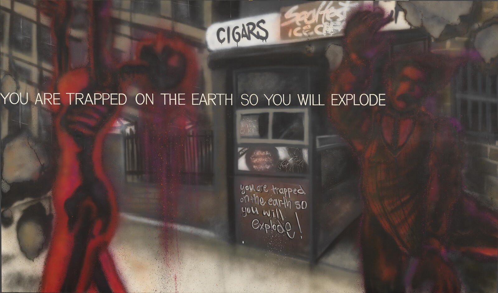 Such divisive tensions are found in the exhibition’s opening work: Ben Solomon’s short video Dirty Laundry (False & Blake) (2023), in which a graffiti writer tags buildings around Times Square at night. Coupled with the looping synthpop of Don Henley’s 1982 track “Dirty Laundry,” it reads as an ironic riposte to the area’s well-documented history of gentrification. This glimpse of unauthorized lexical attributions to the cityscape is briefly brought to institutional heel with a selection of works from the 1950s and ’60s that also offer some respite from the otherwise male-dominated arena of street graffiti artists. These works include dense overlays of rivetted steel girders by Hedda Sterne; a toxic haze of reds and high-altitude blues in a work by Charlotte Posenenske and Carol Rama’s Forgive my Conjunctions (1968), a seeming silhouette of a body flung into space. Nearby, Martin Barré’s serial strikes of black spray paint evoke the slashes of Lucio Fontana’s monochromes.