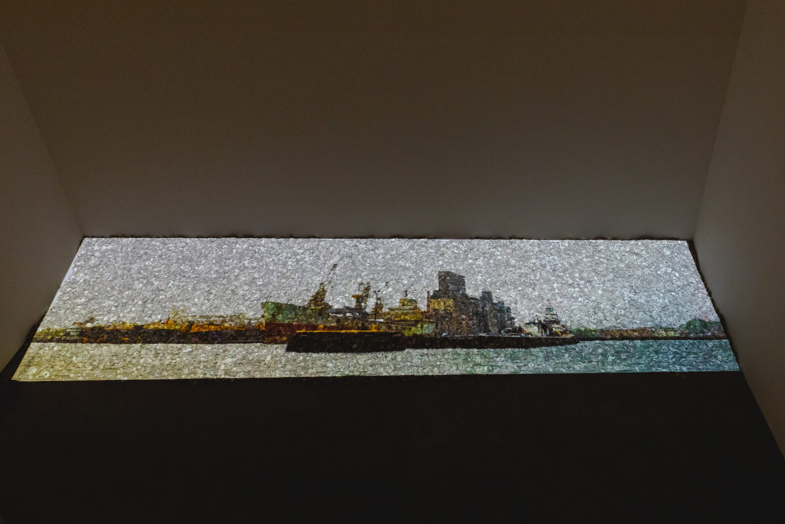 Three paintings by Paulina Peavy, which look as if someone has spliced together the brains of Tamara de Lempicka and Hilma af Klint, are a visual decadence for which I will forever be grateful. But I’m not sure what they are doing in the show, nor why they were relegated to a side gallery in range of Diane Burns reciting her “Alphabet City Serenade” (1989; also fantastic, but inscrutably positioned). Alan Michelson’s Midden (2021)—color video of trash barges projected onto a pile of oyster shells or “midden heap”—is a comment on human impacts on the environment over time that simultaneously criticizes the amount of trash produced by contemporary consumers and undermines Rousseauian fantasies of living at one with nature. It is also a surprising and pleasurable use of surface texture to alter a projected image. The large, colorful pigment prints by Avijit Halder give us a body improbably posed in decidedly unexotic domestic spaces transformed into sites of frenetic performance by what appears to be an excess of sari cloth that has nearly filled the frame and taken on a sculptural solidity. The amount of movement captured here is astounding.