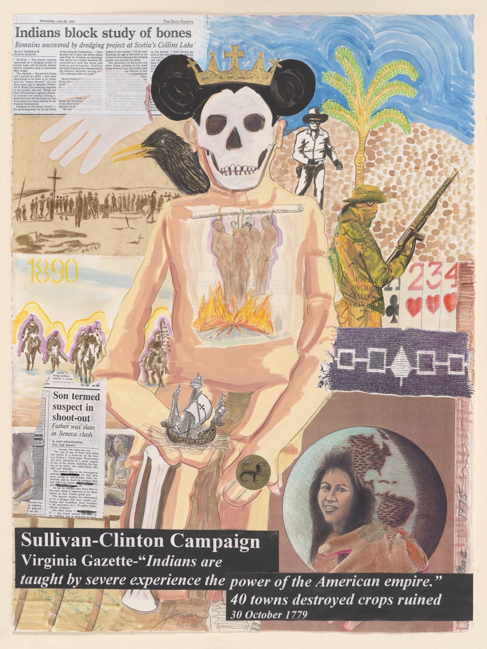 I know that the list goes on, because everyone’s nationality or tribal affiliation is posted by their art. This, rather than strengthening the curators’ statement against racially exclusionary art practices, or challenging the viewer, transforms an actual and largely successful effort into a self-congratulatory and problematic gesture. I cannot stress enough how important it is to actively diversify the artistic production on view in major institutions. Hiding behind “death of the author”-style arguments is no longer acceptable. But there is something disturbingly close to Enlightenment taxonomies of race here. The implication is that knowing the race or nationality of an artist conveys some particular information about the person or what they are doing or intend to do. This is the logic of racism. Biography can, of course, convey meaningful knowledge. When Burns recites “I hate Doris Day/I hate Chevrolet/I hate Norman Bates/I hate the United States” and asks questions about sublets and gentrification, the fact that she is a Native American from Kansas living in Manhattan’s Lower East Side matters. But more often than not, this census-style foregrounding of official identities reinscribes hierarchies by directing viewers to consider race or nationality as a significant, if not primary factor, in the production and display of the work.