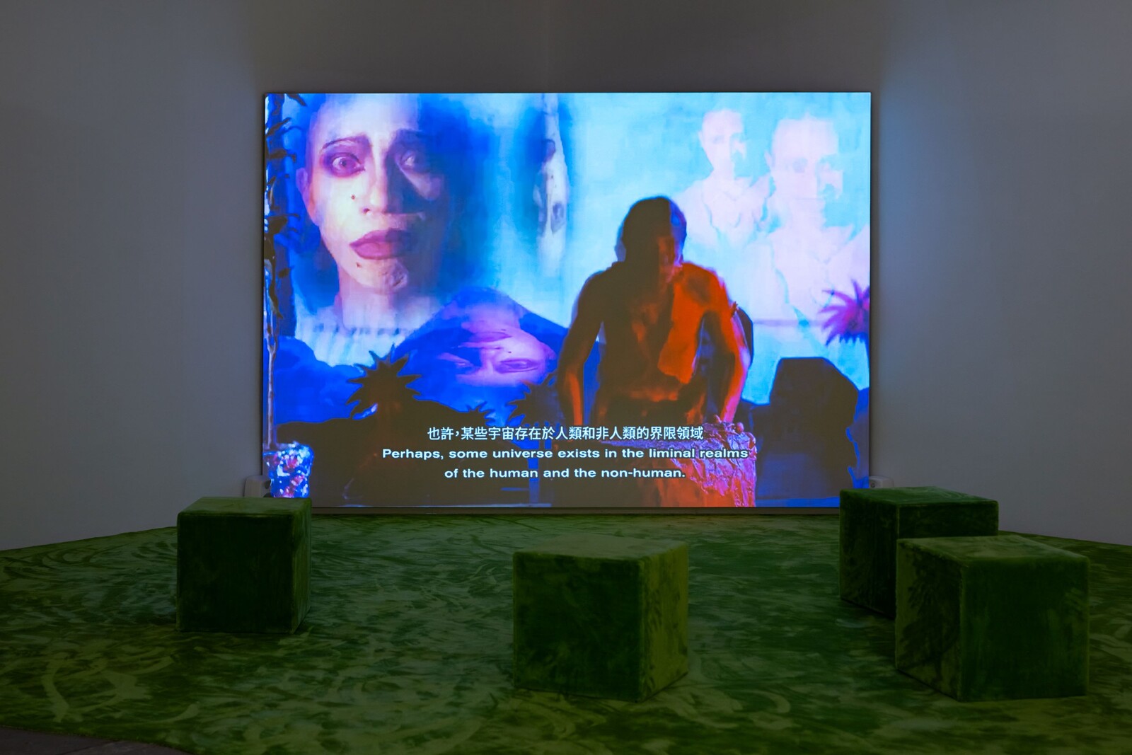 Natasha Tontey’s video installation Of Other Tomorrows Never Known, installed in the second gallery, extends these ideas by looking at Minahasan cosmology from Indonesia’s North Sulawesi. The video, which begins by describing astronomical knowledge as “the first technological application for the people,” tells the story of Makatana, “a manifested artificial intelligence encrypted by the supreme cosmic being,” which writer Nuraini Juliastuti describes as “the spirit, collective principles, and technologies for life.” An aesthetic cross between a German Expressionist gothic horror and a camp, psychedelic Technicolor B-movie, the film leans into the framing of Indigenous stories under colonialism and Christianity as scandalously taboo. What emerges, as with “Green Snake” as a whole, is a reclamation of the living world as a transgressive cult phenomenon worth following.