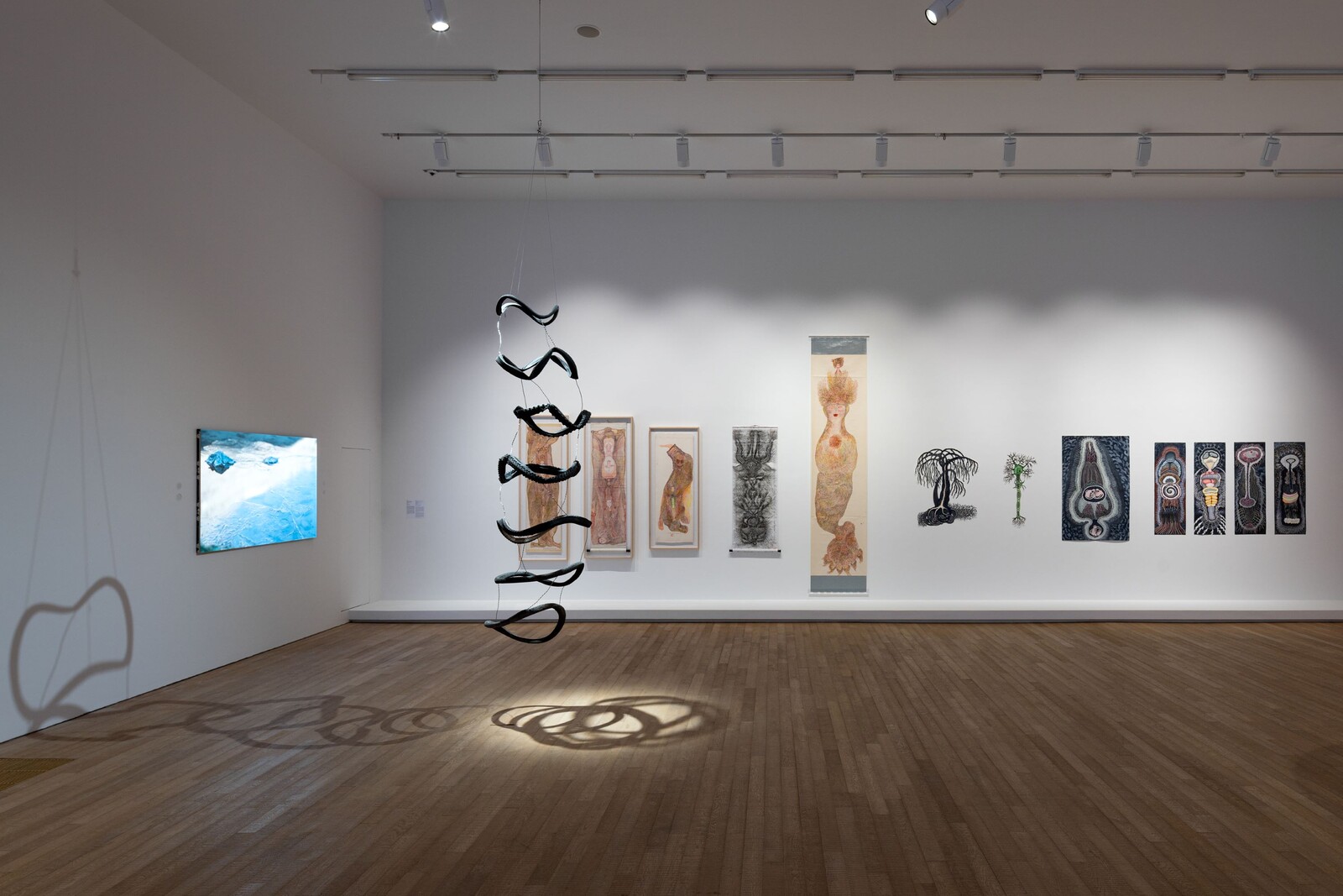 Of all the works in this gathering of cosmological and ecological perspectives, one is anchored directly to the exhibition title. Two moon gates open up the wooden frame enclosing Candice Lin’s Kiss under the tail (all works 2023 unless otherwise stated), where floorspace padded with tatami mats hosts ceramic cats, one with a house for a head, and an indigo-dyed carpet whose patterning replicates a nineteenth-century diagram of a castration by a western missionary who studied eunuchs in China. These gates, and the transformational space they envelope, reference a central location in Tsui Hark’s 1993 movie, Green Snake, a retelling of an ancient Chinese folktale about two female snake demons who endeavored to become human. In the film, the single-minded White Snake pursues the love of a studious male, while the free-wheeling, shapeshifting Green Snake tries to understand the desire that drives her centuries-long companion to her doom. In the end, Green Snake rejects the human world with its apocalyptically heteronormative devotions and questionably immutable morals, realizing she had known love as an affirmation of life all along. So she returns to the water, or rather to nature; an idea that runs through this show.