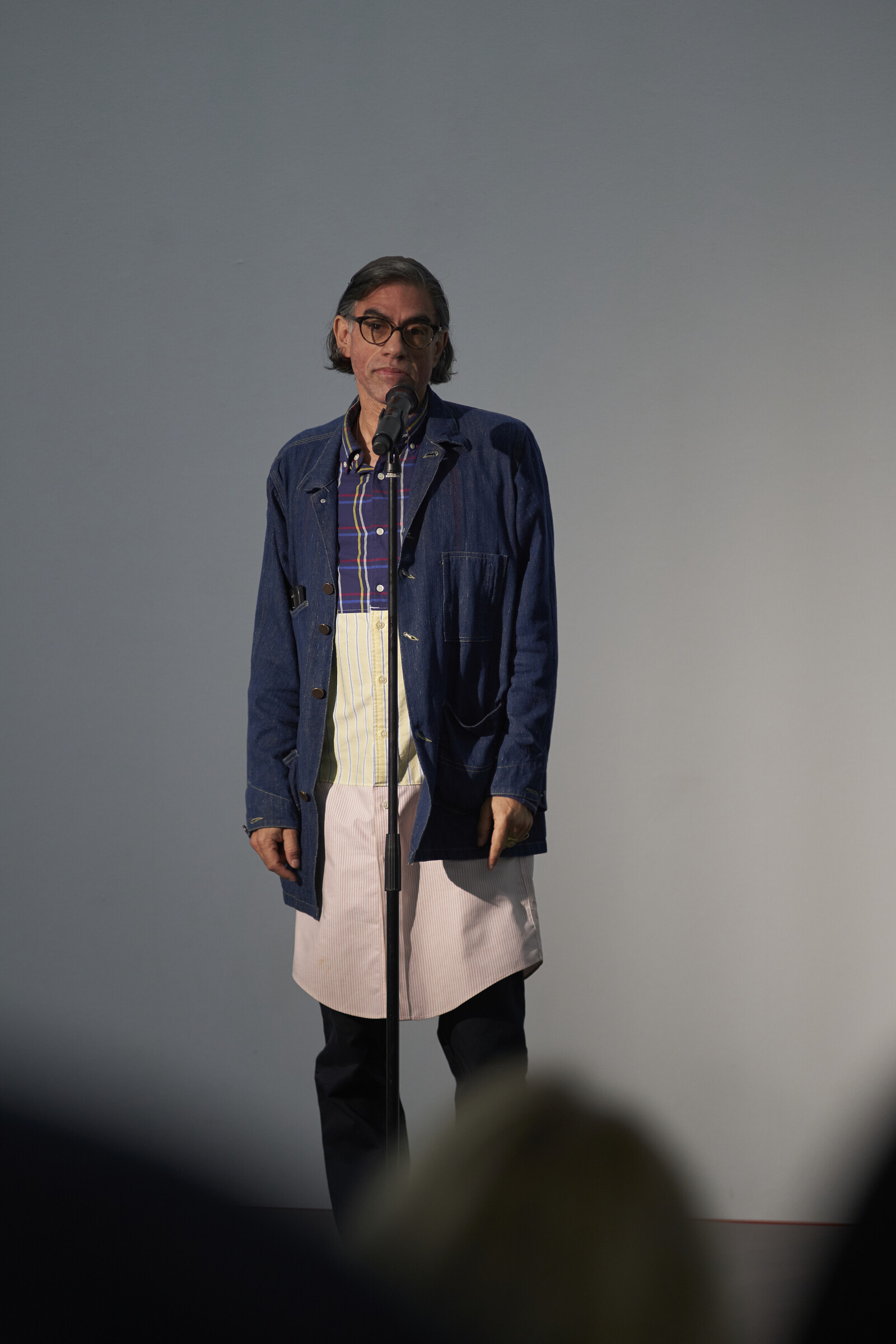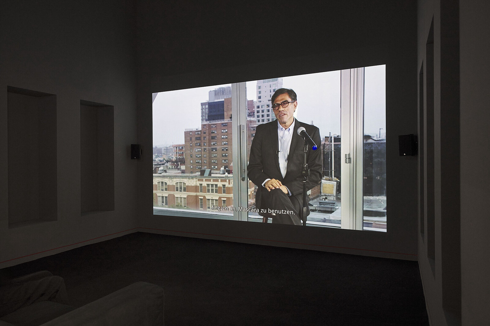 In the plaza, the mumble of speech from nearby videos seeps in. The centerpiece of the exhibition is a compilation of extracts from several existing works, projected large scale in a central enclosed room. Five acts, from 2012 until now, compose what Bordowitz calls an “autobiographical documentary,” each offering a different format of the spoken word—comedic stand-up, lecture, sermon, poetry reading, song—and each a different version of the artist. The compilation is lengthy (eighty minutes in total) so I watched it in parts, popping in and out on my way to and from other areas of the show, catching snatches of Bordowitz in a bright red suit and striped shirt reading his long elliptical poem “There: A Feeling,” its title borrowed from Celan. Or Bordowitz slick in grey, performing a deadpan rendition of his childhood in Queens, growing up as a third-generation Yiddish-speaking Eastern-European Jew, and a “faygeleh” at that. In another extract, he is delivering the Yom Kippur sermon in yarmulka and prayer shawl, talking about divine inspiration, the word of God, and Judaism as “an ongoing conversation”. In another, he wears a patchwork pullover and ruminates on his long-held belief that “art can change the world.”