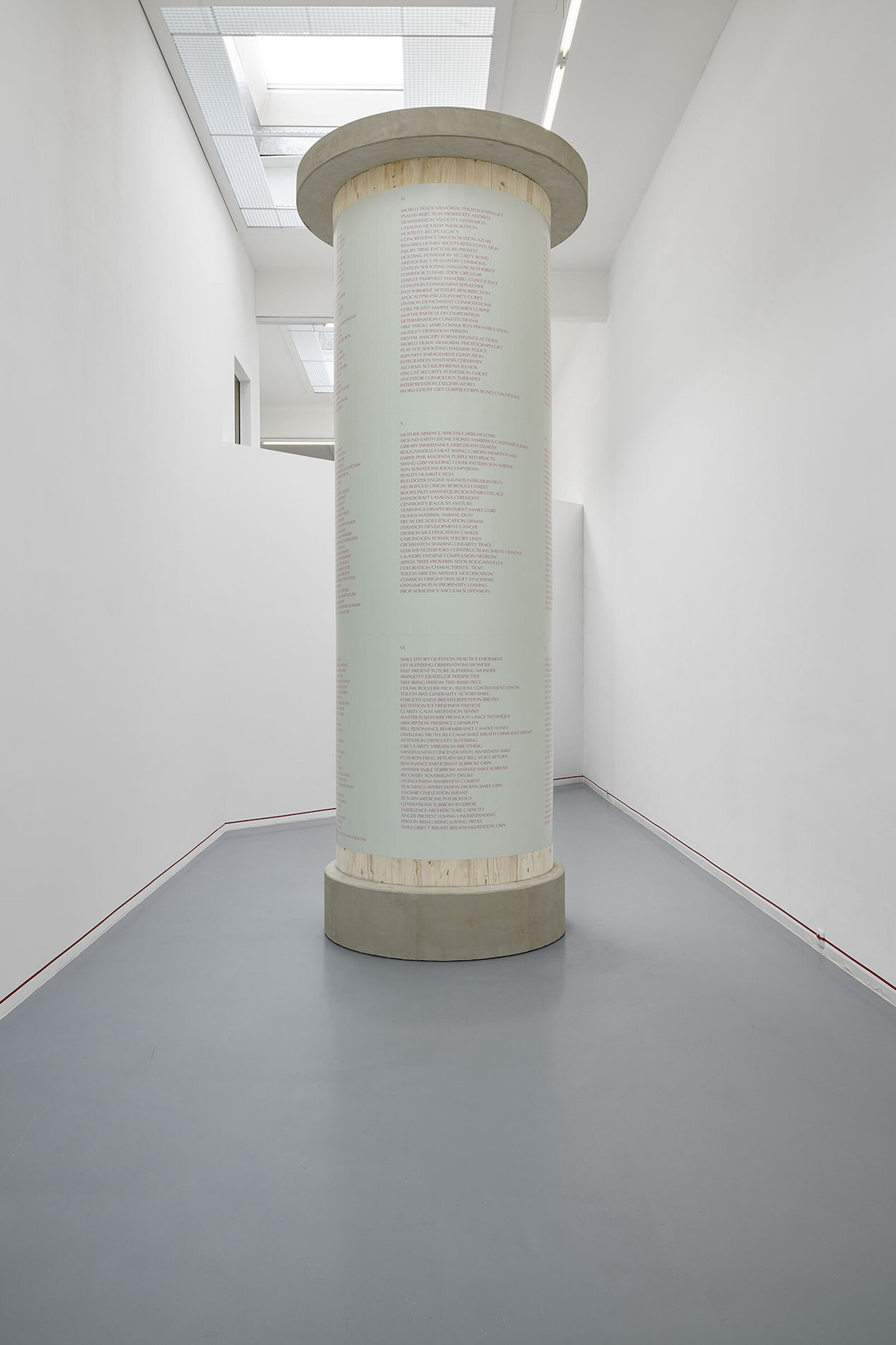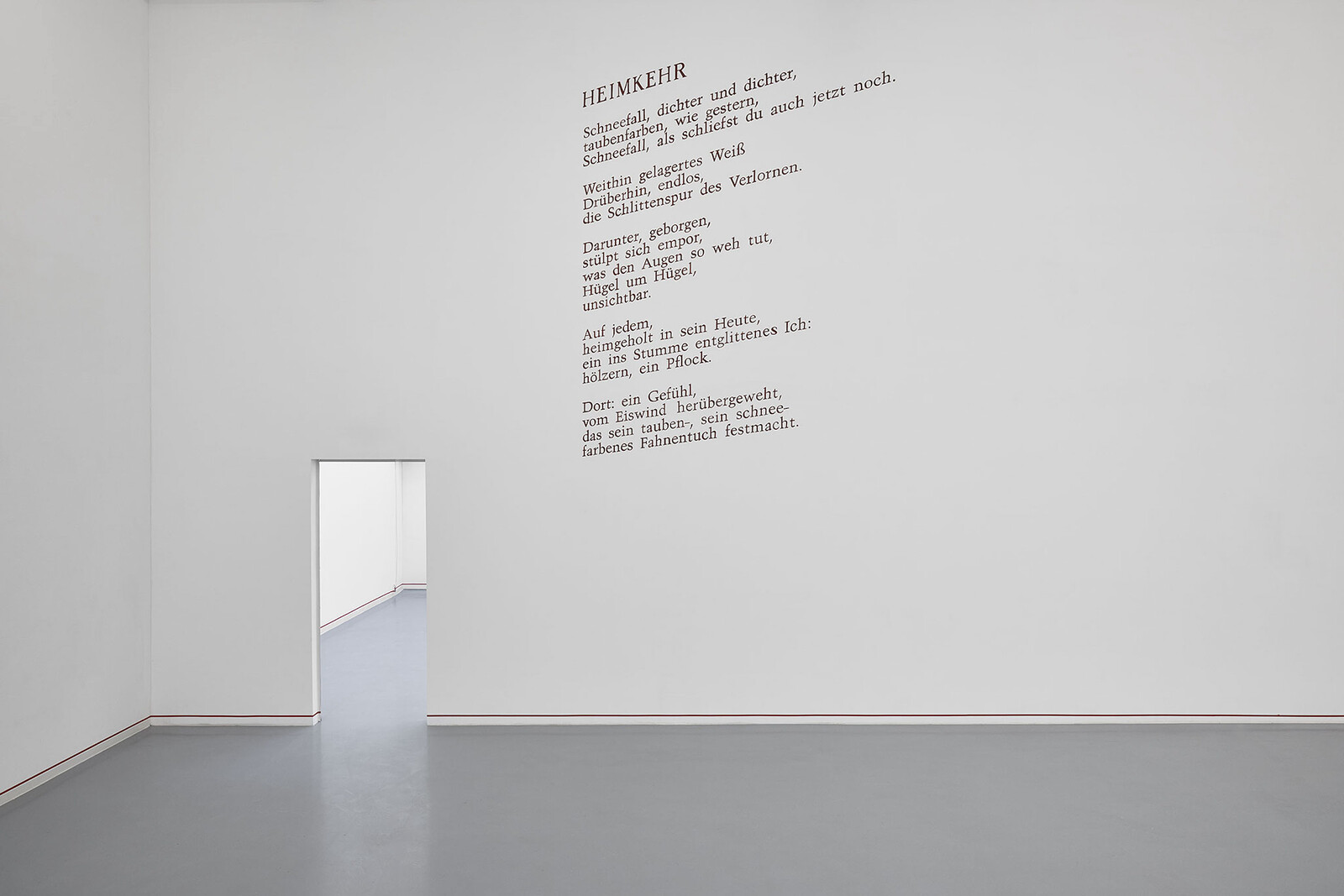Several canny architectural interventions, not in fact devised by Bordowitz but left over from Michael Kleine’s exhibition last year, articulate a surprising spatial dramaturgy. Inverting the usual entranceway, we are led instead around the back, arriving in a large open space something like an indoor public plaza. It is furnished with a few simple objects, more prop than sculpture: a white-painted bench, a low brown stage, a large advertising column like those found on German streets, and a gathering of rudimentary cloud-like forms affixed to one wall. Sparse and indefinite, it suggests a space for thought. Here also are the show’s first words, not Bordowitz’s own but Paul Celan’s, whose poem Heimkehr (1955) is painted, slanting, on the wall. The slant suggests that our angle on language—or history, or art—is key to meaning. Subjective perception intersects with words (or art, or experience) to create something new.