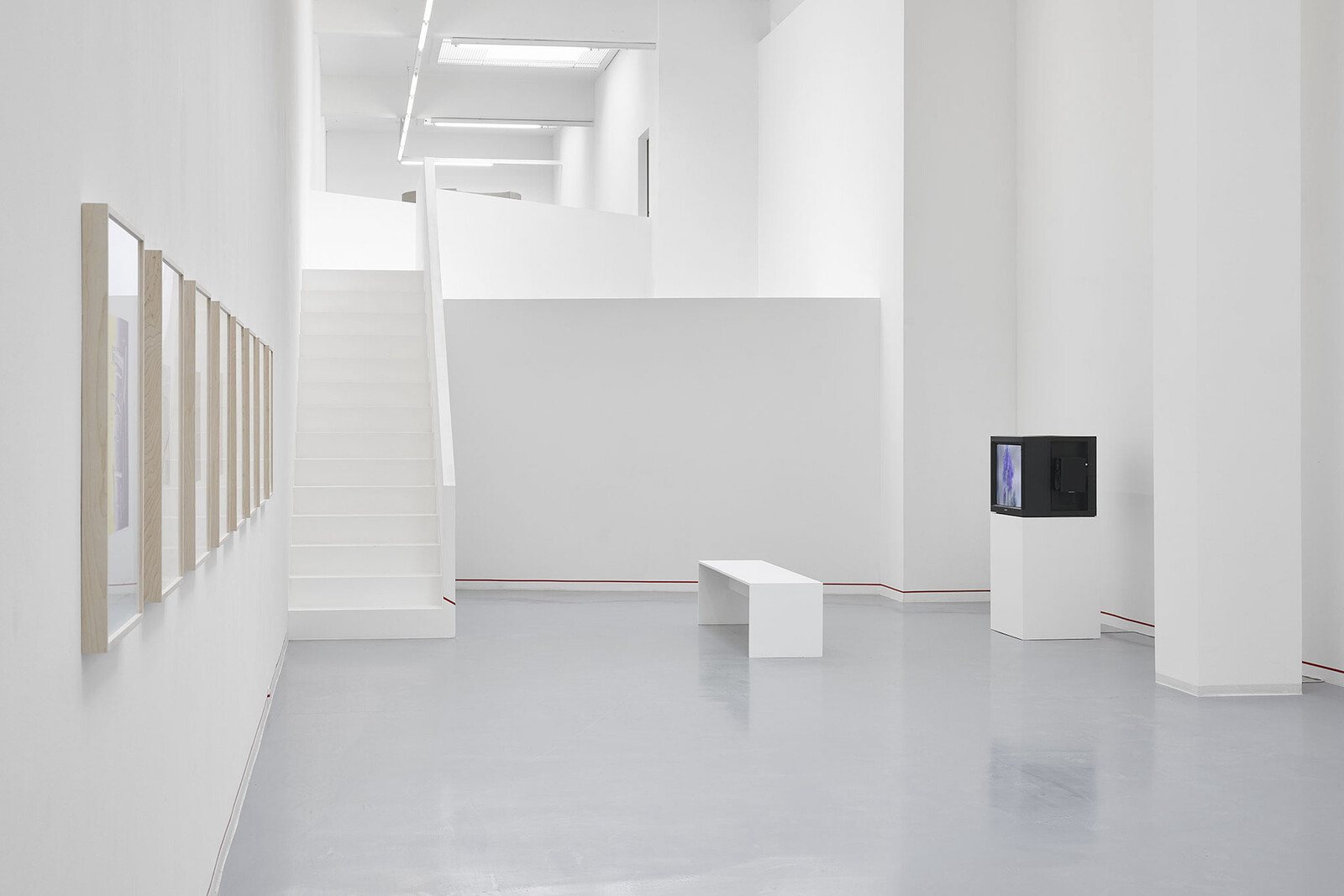 To create an exhibition from this ephemeral practice is audacious, particularly in the Kunstverein’s cavernous former flower market hall, but Hellberg has a track record of conjuring shows from unruly or nebulous bodies of work (David Medalla’s 2021 retrospective, for example, or the large-scale solo exhibition of Georgian artist Tolia Astakhishvili in 2023). In the absence of discrete objects, the exhibition relies on subtle gestures, the first of which is a narrow red line affixed to the wall, three inches from the floor, that follows the entire perimeter of the exhibition space. It establishes intention and constructs a kind of “holding environment,” to borrow the term of psychoanalyst D.W. Winnicott. It is also, literally, a roter Faden, or “red thread,” the German term for “common thread.”