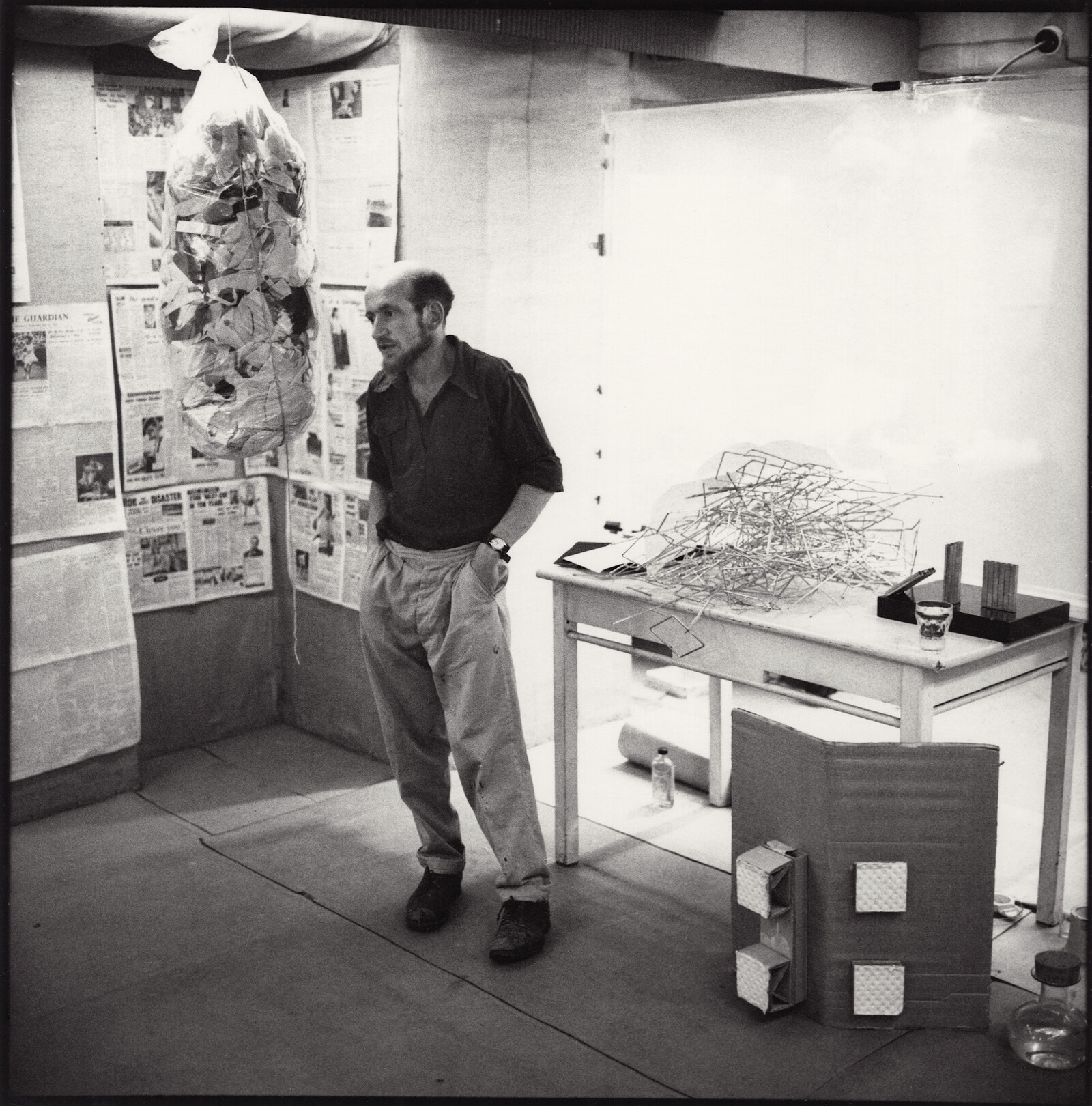 The somewhat vague language of “transformation” belies the sharply articulated leanings of the artist in a book, published alongside the exhibition, of his interviews with Hans Ulrich Obrist between 1995 and 2017. It reveals a man who not only hated capitalism but discouraged the use of the word “environment” in favor of “damaged nature.” The show includes a film of Metzger’s iconic 1961 demonstration on London’s South Bank, where he and some architecture students stretched out large sheets of nylon. Metzger painted the nylon canvas with hydrochloric acid delivered through a spray gun, a live painting and protest against nuclear expansion. The film shows Metzger wearing a gas mask and closeups of the nylon tearing and deteriorating, revealing the cityscape behind it.