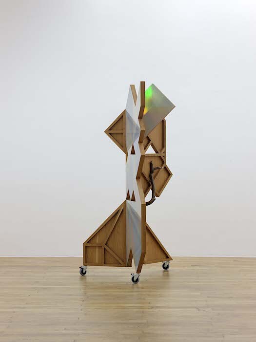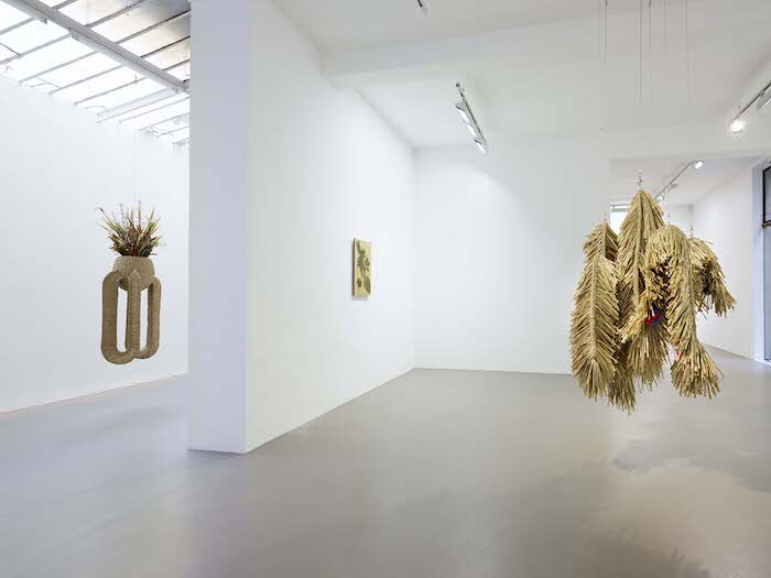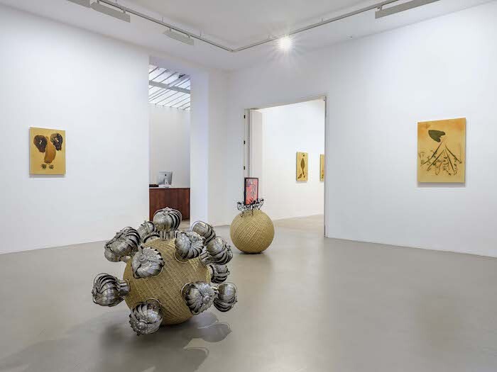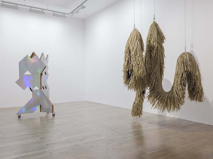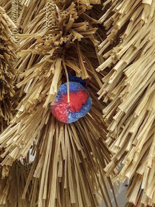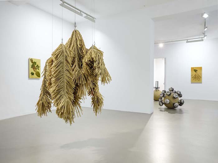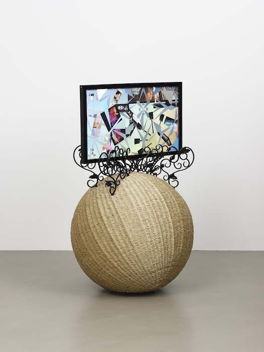 Part of sculpture series “The Intermediates” (ongoing since 2015), Antenna Basket on Rings (2017) and Psychic Turbine Vent Ball (2017) use household industrial components such as TV antennas and wind turbines to adorn crafted rotatory bodies made of artificial straw. The same material reappears in the freestanding and suspended sculptures Serpent Creature, Tinted Serpent Creature, and Triple Tentacles Serpent (all 2017). Drawing on the same narrative that parts technology and craft, progress and folk, the organisms confound formal boundaries by connecting animal mythology, globalized technological expansion, and domesticity. Recalling vernacular shelters, disproportionately large cleaning rags, or even lavish chandeliers, the three works speak to the modern failure to tame processes of hybridization. Contiguous with Triple Tentacles Serpent, the two-sided Faceted Dancing Mask (2017) articulates and sieves the space. Covered by lenticular foil on one side and unclad on the other, the movable folding screen invites visitors to play with views of the gallery and of the boundary-making processes resignified by the artist to foster new kinds of storytelling.