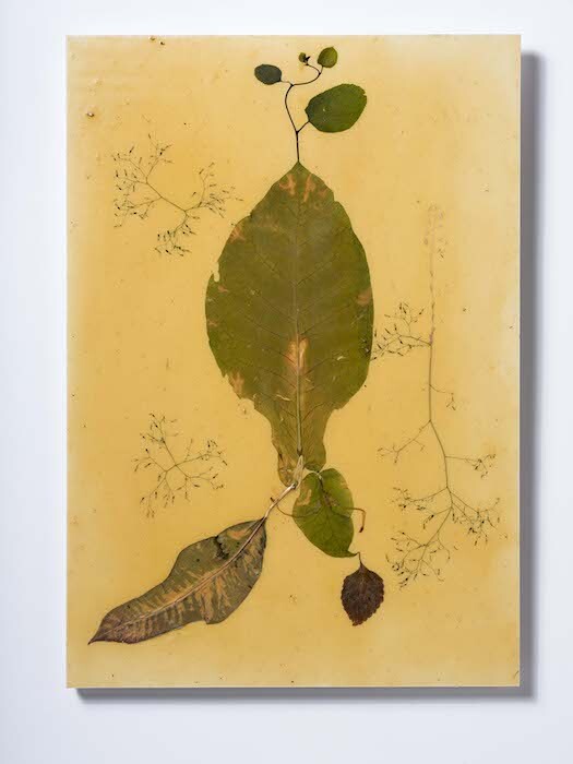 In the 2017 instantiation of the series “Lacquer Paintings” (ongoing since 1994) Yang uses time as her subject matter. Common botanical specimens, such as tobacco leaves, are organized on small wood panels in the tradition of colonial botanical arrangements. Yet, suspicious of material processes of memorialization and their capacity to give meaning to a disordered chronological force field, Yang lets the slow-drying wood varnish capture the dirt, dust, raindrops, and insects present in the original materials and in the making of the work, as traces of the duration of that particular event.