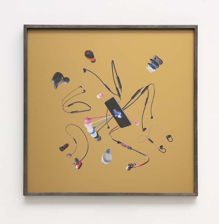 While in her discourse Yang positions abstraction at the frontier of form, collapsing real and imaginary kinds of value (including that of the human body and technological gimmicks), her studio practice convolutes these tropes. This is the case with the series “Hardware Store Collages” (ongoing since 1994), where indexed images of hardware and quotidian electronic components are released from their functional context and framed as unfamiliar organic assemblages. At Chantal Crousel, Media Markt smartphones and Saturn Bluetooth speakers are the subject of compositions that intensify technological narratives of hybridity. Swaying Television Ball (2017) places a two-sided flat-screen monitor atop an exercise ball made with artificial straw and stainless steel. Cutouts from commercial hardware catalogues cover the monitors’ surface, and these in turn depict portraits of women and animation stills from such films as The Lion King (1997). When fitness training cannot singlehandedly capture one’s focus, the intensified lore of the technosphere might get the job done.