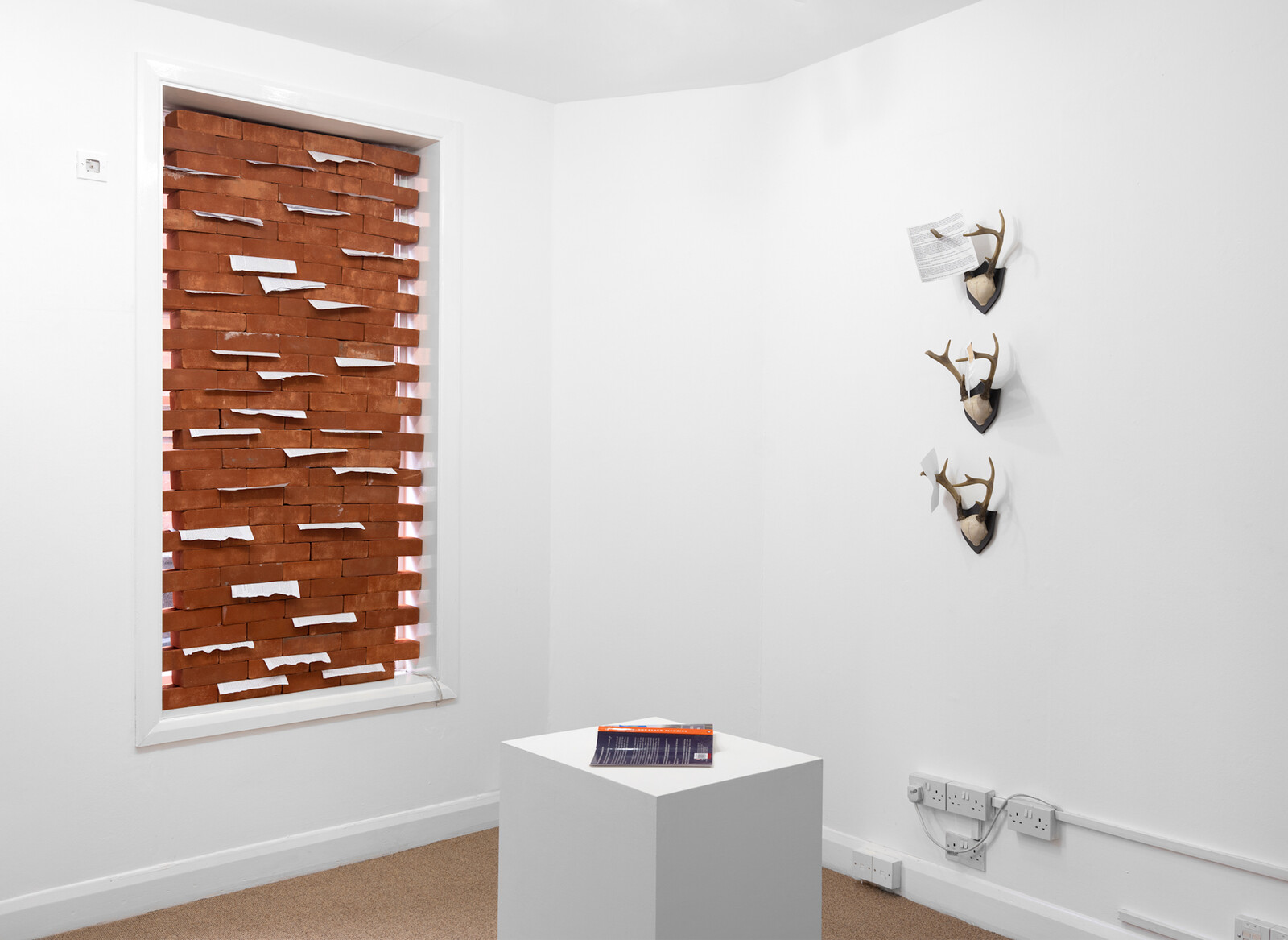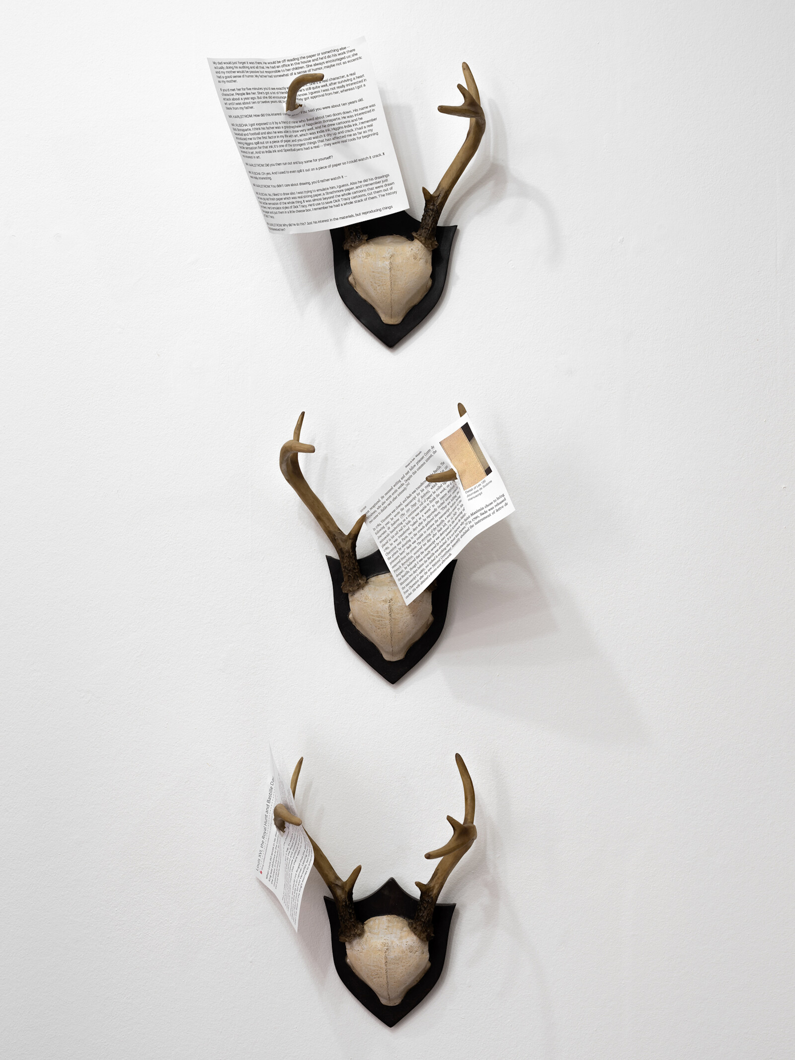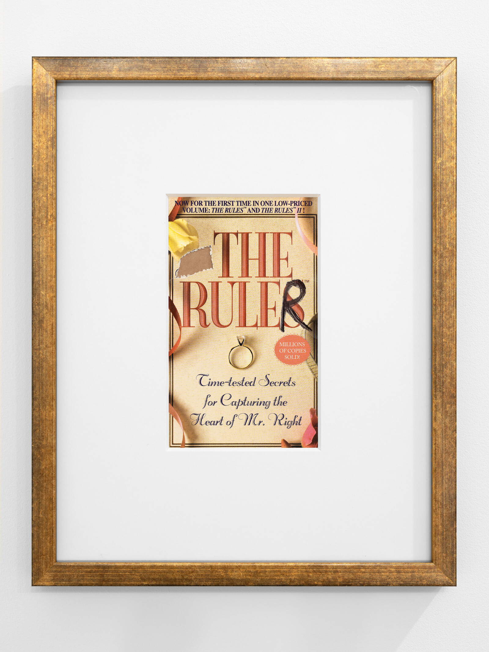 In his 1993 book On the Museum’s Ruins, Douglas Crimp contended that artistic strategies of reproduction and appropriation—such as those found in Ruscha’s artist books—undermined the “originality, authenticity and presence” that had previously been “essential to the ordered discourse of the museum.”1 Black’s detournément of “oof” to “rien” reframes these conversations by demonstrating that social reproduction, a line of inquiry often valorized in postmodern critiques of the museum, is itself neither neutral nor universally inclusive. As indicated on a printed text skewered on a fake deer antler in the wall-mounted sculpture The Hunt I, “rien,” or “nothing,” was King Louis XVI’s aloof diary entry on July 14, 1789, the day the Bastille was stormed. His surreal, paradoxical jotting—which may have been referring to an unsuccessful hunt earlier that day—anticipates the semantic nihilism that many artists would later diagnose as a product of industrial alienation.