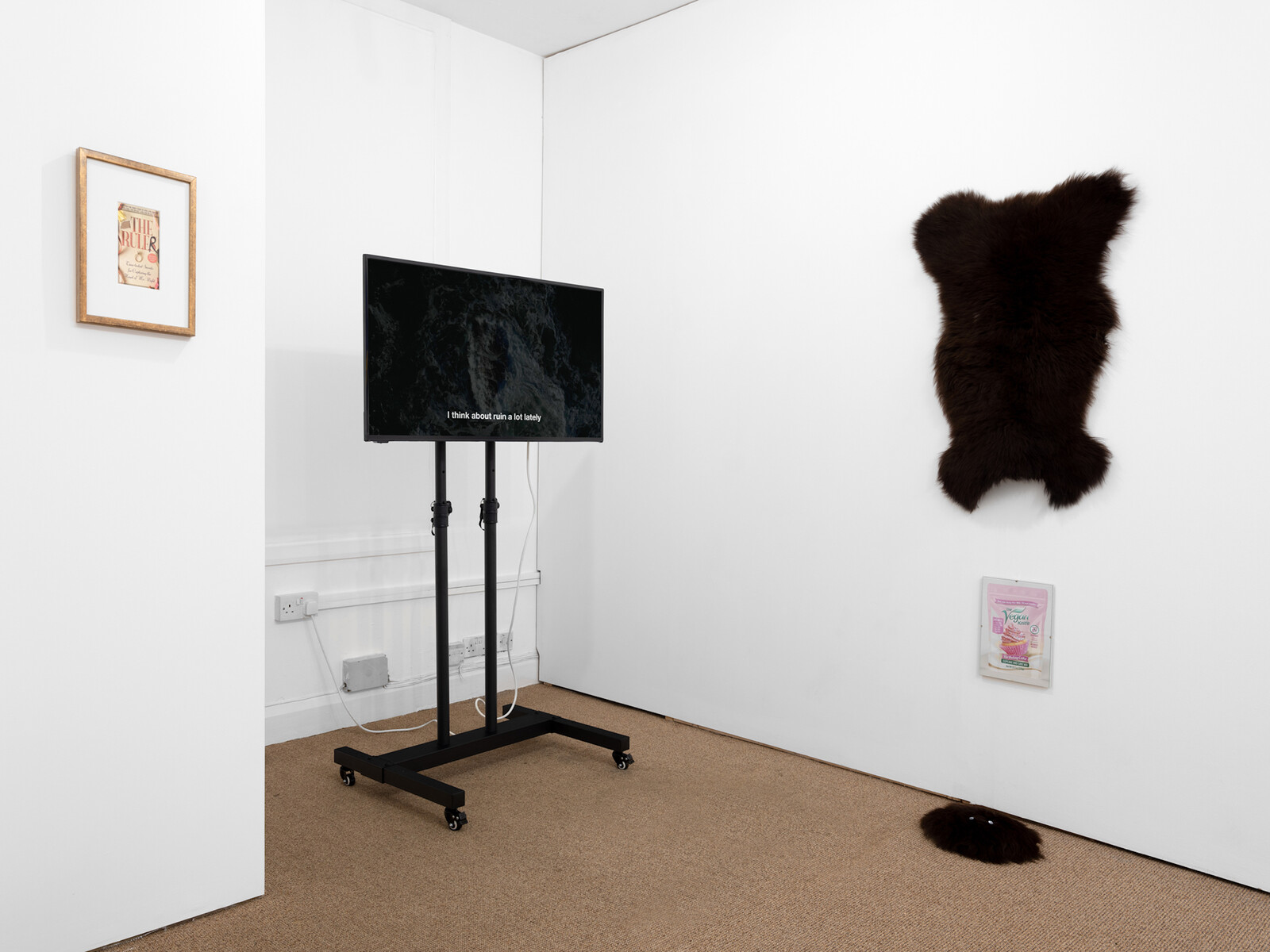 Nearby to Oof, the soundless, four-minute video Ruin I (2020) loops on a flat-screen monitor. Closed caption text recounts a scandal concerning a “well-intentioned artwork” that, the viewer is informed, heedlessly perpetuated a global system of racial violence. Black does not reanimate the spectacle of the artwork—a white painter’s depiction of Black suffering displayed in the 2017 Whitney Biennial in New York—by naming it. The viewer instead learns that a critical response to the artwork’s complicity in “bringing ruin to lives” was met with contempt, eliciting debates concerning the “inviolability” of art. The proximity of Ruin I and Ruin II to Oof assesses a cultural logic in which Blackness is coded as nothingness at once inherent to, and externalized by, the production of value. “How to de-create value?” the video asks, querying contemporary art’s genesis in the conditions of racial capitalism.