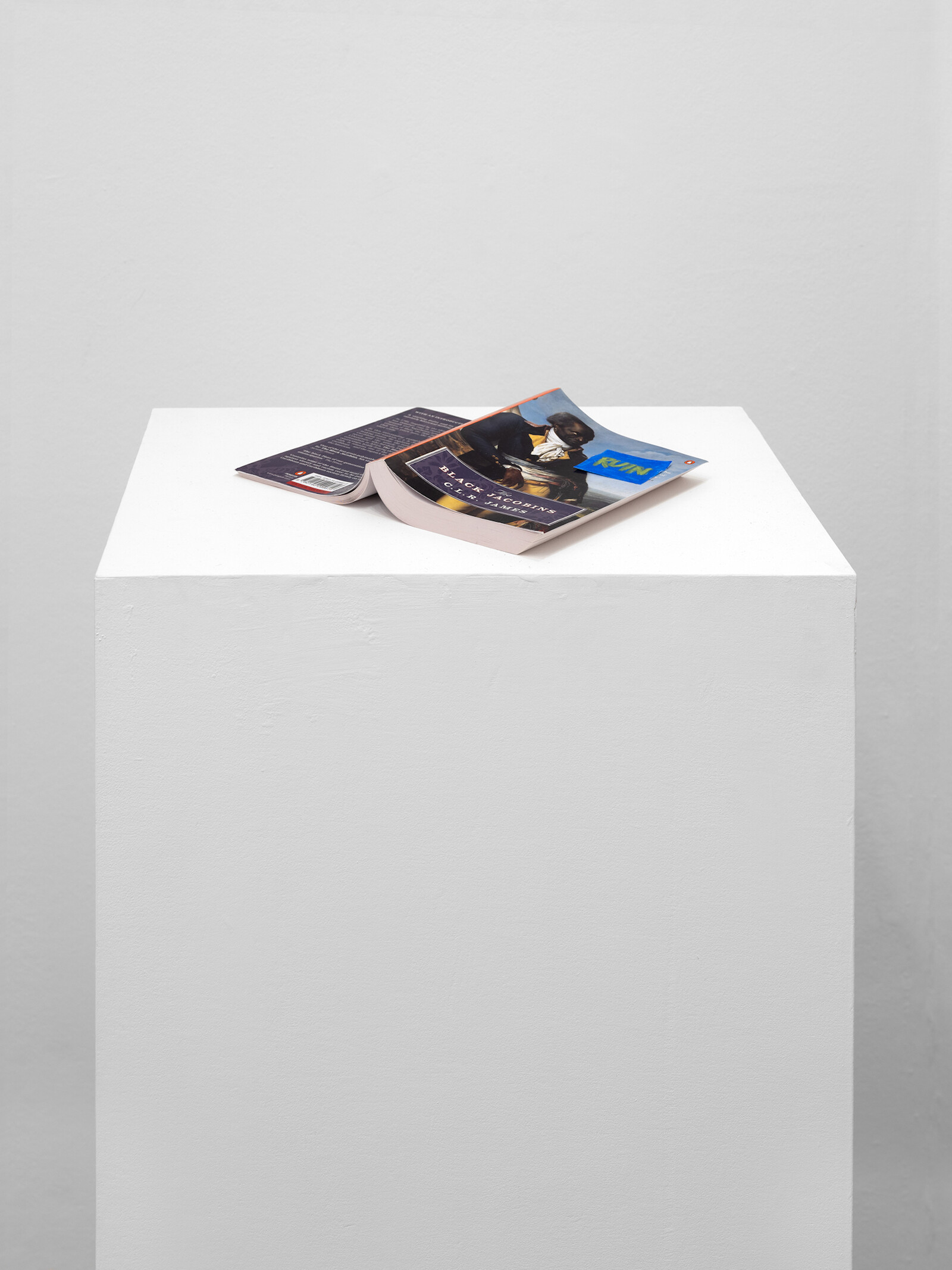 A 2001 paperback edition of The Black Jacobins (1938), C. L. R. James’s study of the dialectical relationship between the Haitian and French revolutions, rests on a plinth in Hannah Black’s exhibition “Ruin/Rien” at Arcadia Missa (Ruin II, all works 2020). Its cover features a detail of Anne-Louis Girodet-Trioson’s romanticist 1797 portrait of Jean-Baptiste Belley, a freed slave who attained the rank of captain during the rebellion and was the first Black deputy elected to the French National Convention. The artist has placed a post-it note on the upper-right corner of the cover. Written on it, in yellow pastel against a blue background, is the word “RUIN.”