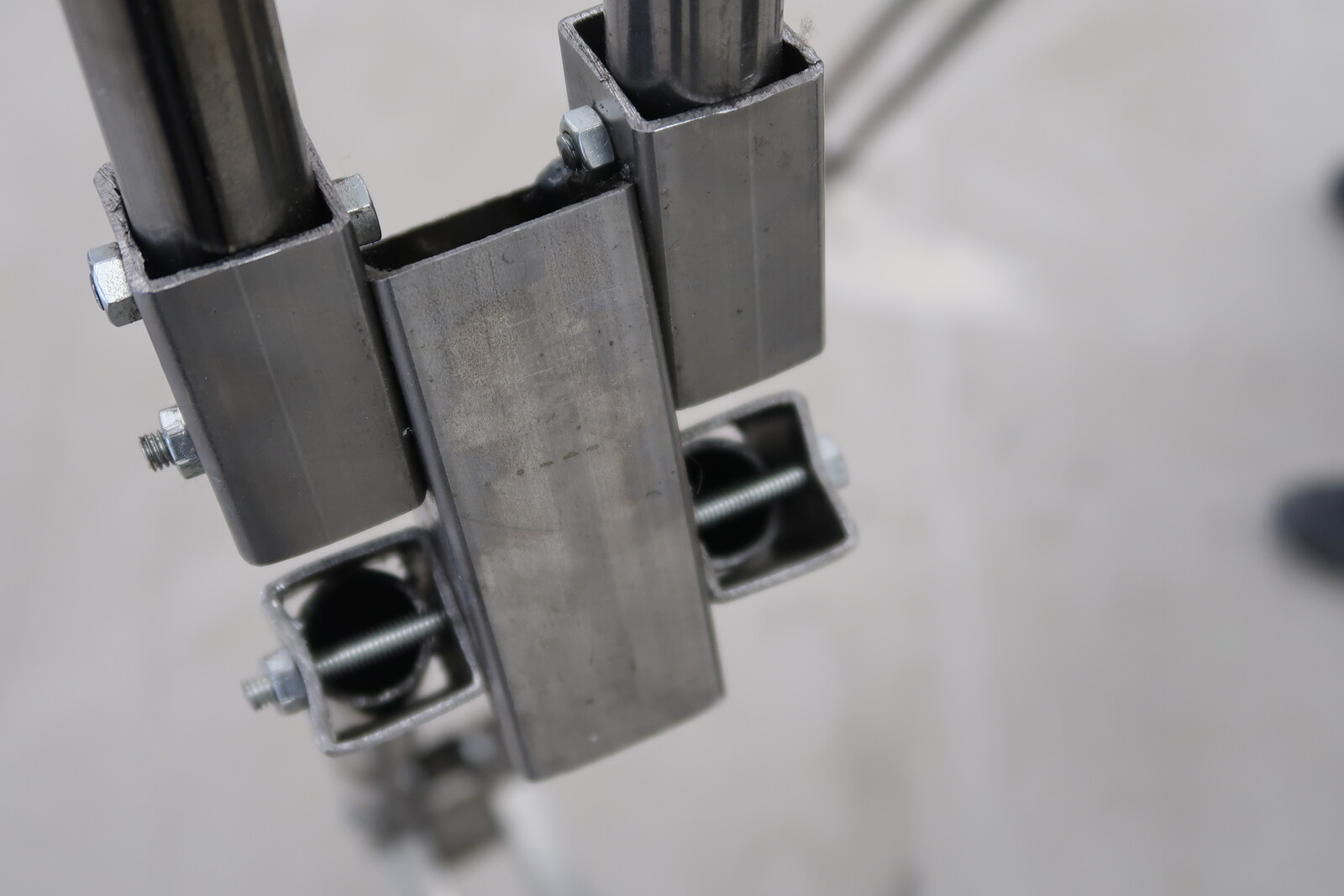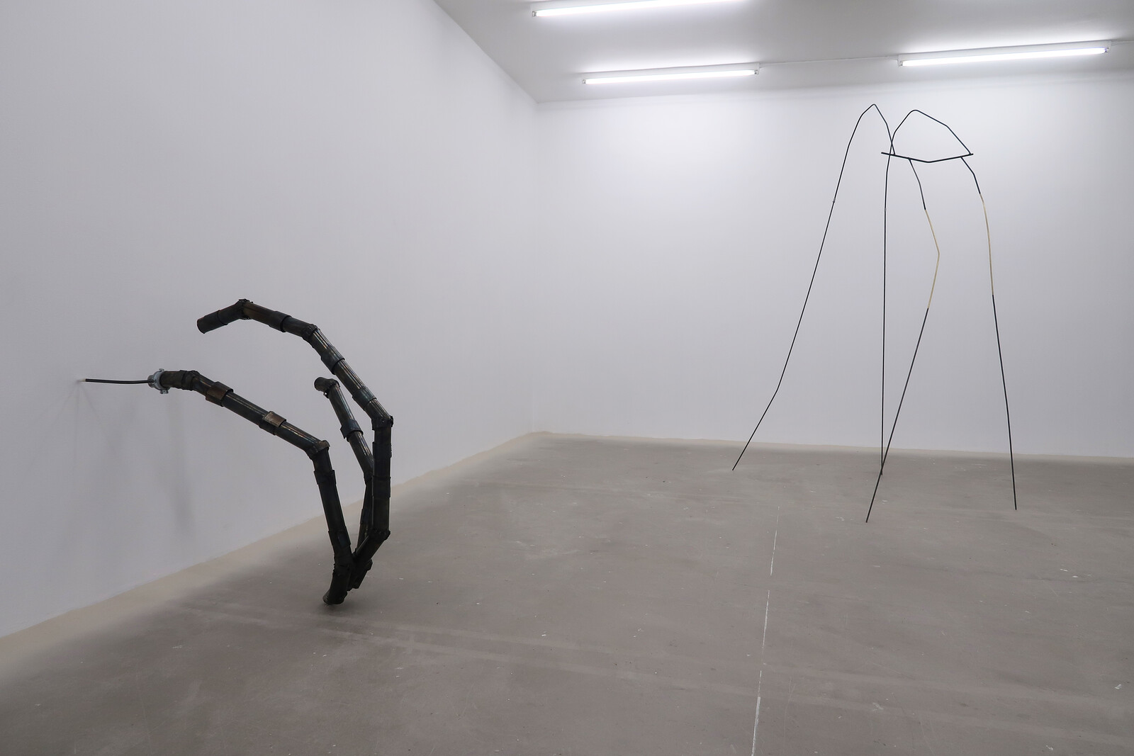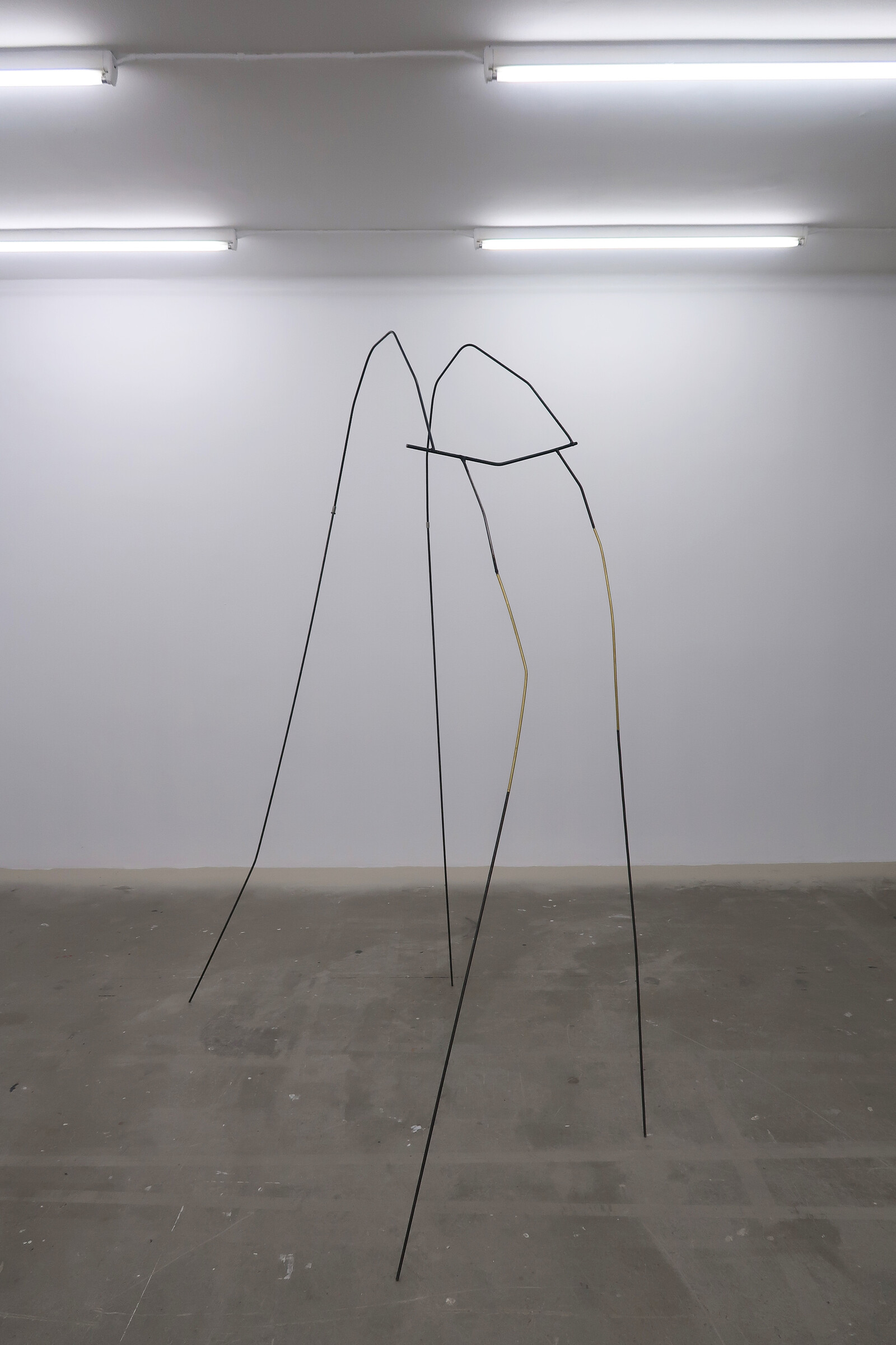 The sculptures are crowded into Index’s exhibition space. Some, such as LAMINE DIENG (2018–21), stoop to fit under its low ceiling. Made of paired solid metal rods and standing on five legs stabilized by at least four joints each, LAMINE DIENG’s formal composition should imply both strength and flexibility, yet it gives the impression of a thing that has been abruptly switched off in the middle of a gesture. The same sense of interruption affects all of Kamaly’s sculptures, and it feels like an act of power intended to limit the development of these careful, dexterous creatures.