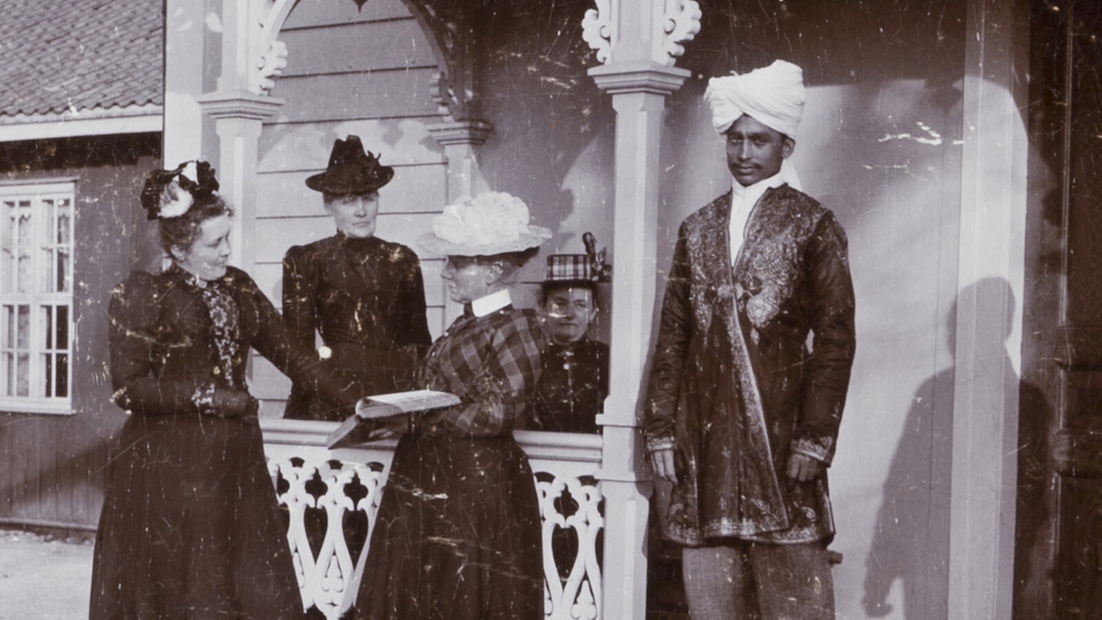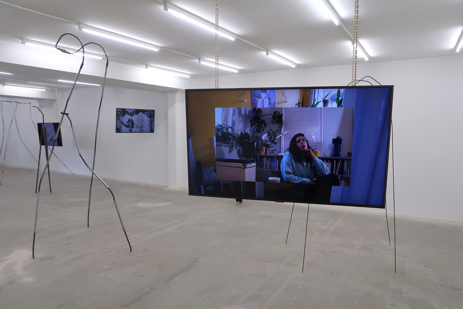 Four flat screens are dispersed throughout the gallery, each showing sections of one video piece entitled Gadju Okabak Ulrikab Koskimo (2021). Hung from the ceiling by brass-plated chains, each traces an episode from Swedish history when a non-white person was objectified. The editing seems straightforward at first: the artist scrolls through a newspaper dated 1901, panning over photographs from travelogues published during this era. Kamaly turns a page and then zooms in to reveal the obscene accumulation of things acquired while traveling in colonized countries by Mathilda Hamilton, a white Swedish woman who would go on to found the popular home goods store Indiska.