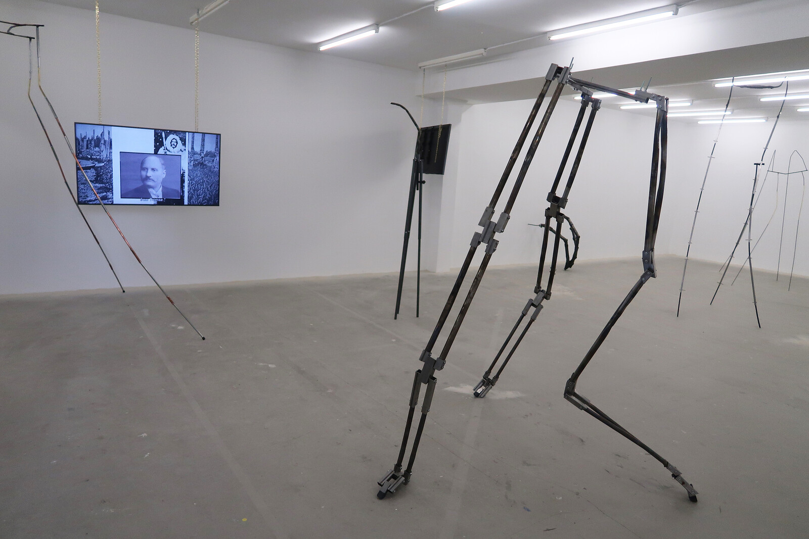 Kamaly maps the connections between documents in a deadpan voice-over, yet rushes through the seams joining each story. Narrative information leaks out of the artist’s montages. That Kamaly knows about the infinite play of formal or physical responses to the impossible conditions of life some people face is clear from each joint in KARIMA (2021), which is painstakingly welded to accommodate brass, then copper, then iron metal tubing, as though tracking every time it has had to transform to survive. By contrast, the video illustrates the simple yet destructive fact that people were objectified under colonialism. The direct approach Kamaly uses in the videos fails to transform the image of racist and colonial objectification into something capable of testifying to its violence without reproducing it—a failure that is made all the more frustrating by the extraordinary expressiveness of LAMINE DIENG, that towering mechanical form that, cut off at its hypothetical waist, staggers under the weight of a body it no longer carries.