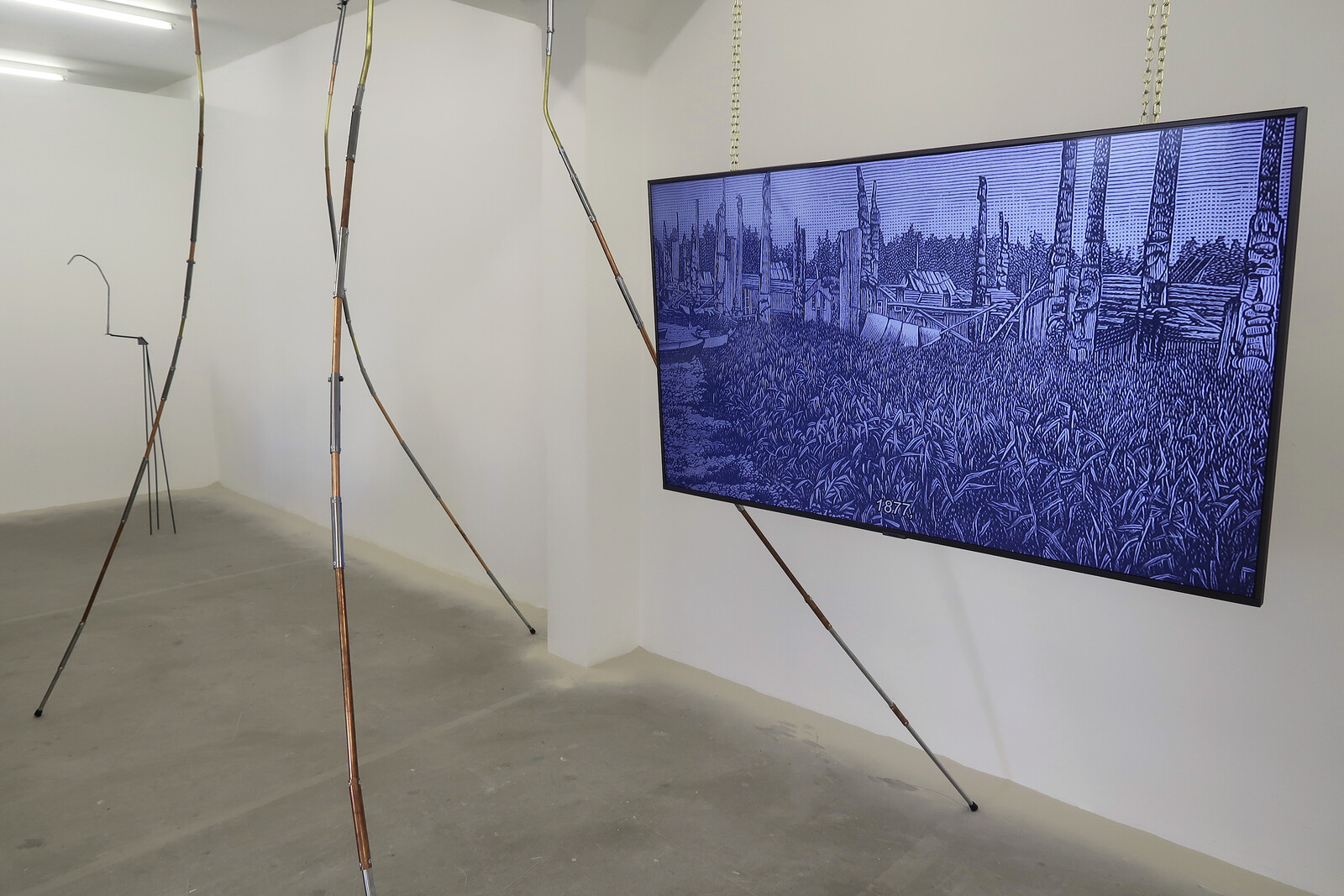 Nevertheless, there is a series of narrative fragments lodged in the videos with no explanation that do suggest the affective complexity I see in the sculptures: a large gorilla kneeling at the edge of his enclosure in an open-air zoo and tenderly prodding the prone form of a human toddler who must have fallen into the pen; a blurred fin-de-siècle photograph of an Indian man who converted to Christianity and traveled to Sweden with his missionary benefactor who is caught in the middle of a gleefully explosive snow fight; the painful footage of Indigenous people from Bella Coola Valley in British Columbia being permitted to see a totem pole that belonged to their ancestors for the first time and watching them rub their hands on the wood, confirming that something invisible is still intact. There is some tacit acknowledgement in these and other photographic flickers that something impossibly violent took place but that it did not completely engulf the existence of those subjected to it.