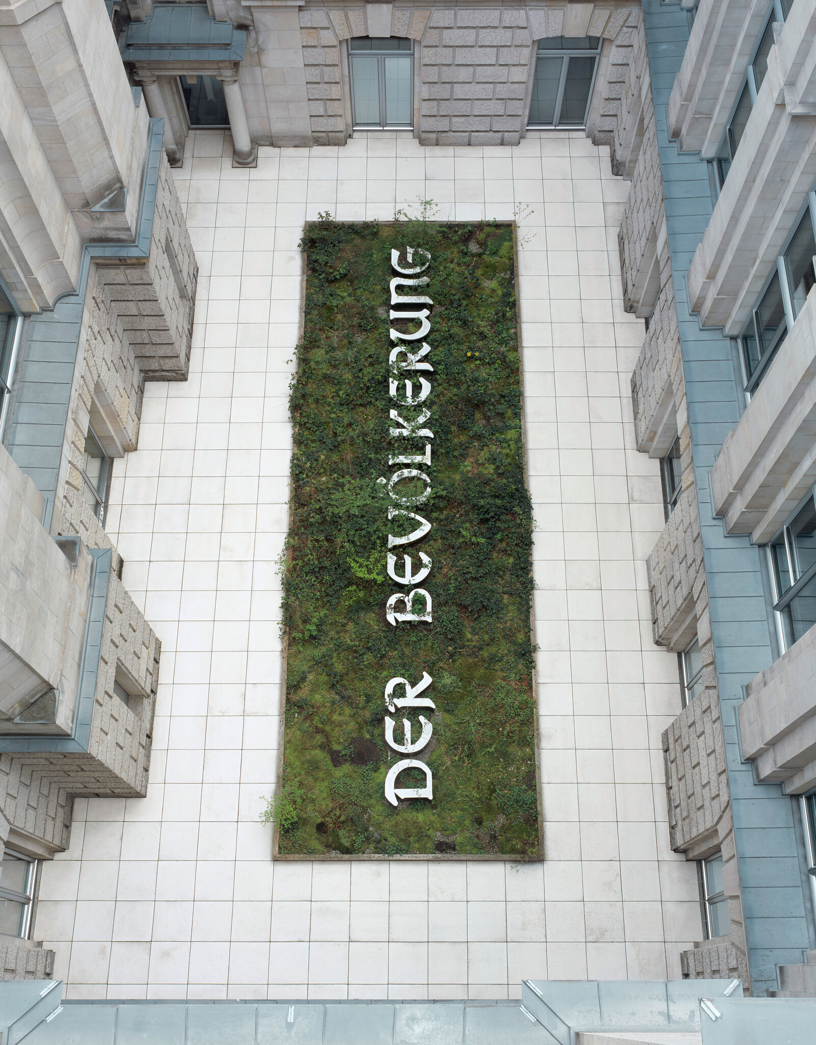 The title Der Bevölkerung (To The Population, 2000) comments on the motto emblazoned on the west-portal of the Reichstag parliament building, “Dem Deutschen Volke” (To the German People); the alteration obviously asserts that a real democracy is not only for autochthone citizens in the country but also for those who migrated there, not least in Germany where the idea of the Volkskörper, the national body, was central to Nazi ideology. The concept proposed that in an inner courtyard, “Der Bevölkerung” would be written horizontally on the ground in similar fractured lettering to that on the portal, surrounded by overgrown earth from the constituencies of all the MPs.