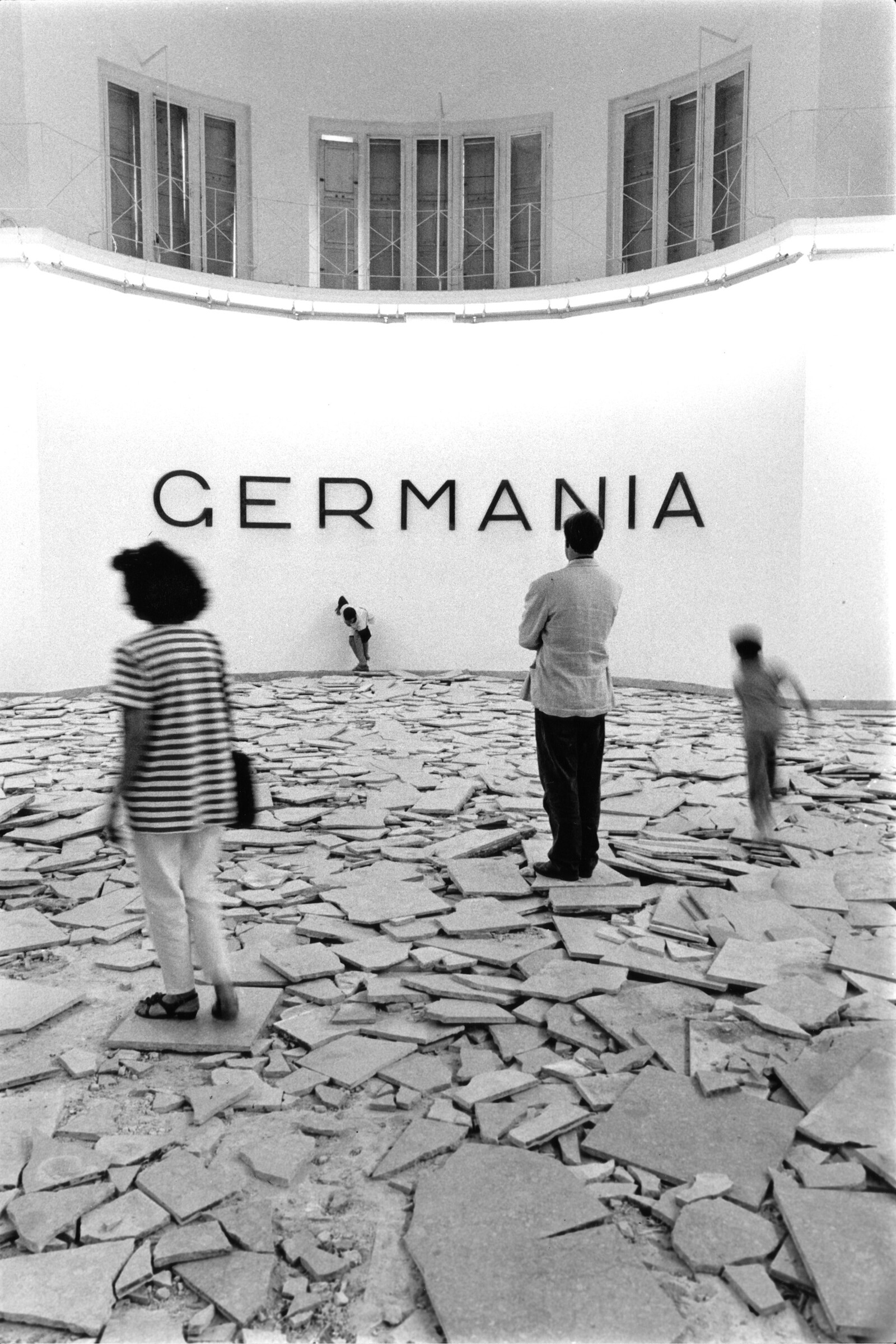 On the stairs up to the first floor, a photograph serves as a placeholder for one of Haacke’s best-known works, his treatment of the German Pavilion in Venice in 1993. With the building’s travertine floor—inaugurated by Hitler himself—chopped up into broken tiles, making visitors stumble around on a cracking sea of ice, and with “Germania” emblazoned on the wall behind, Haacke forever changed the way not only the German, but all national pavilions would be approached. He made it impossible, from that point on, to not think of a country’s history in regard to the perception of its pavilion: as artist and audience alike, you can decide to ignore that history, but if you do, it might come back to bite you.