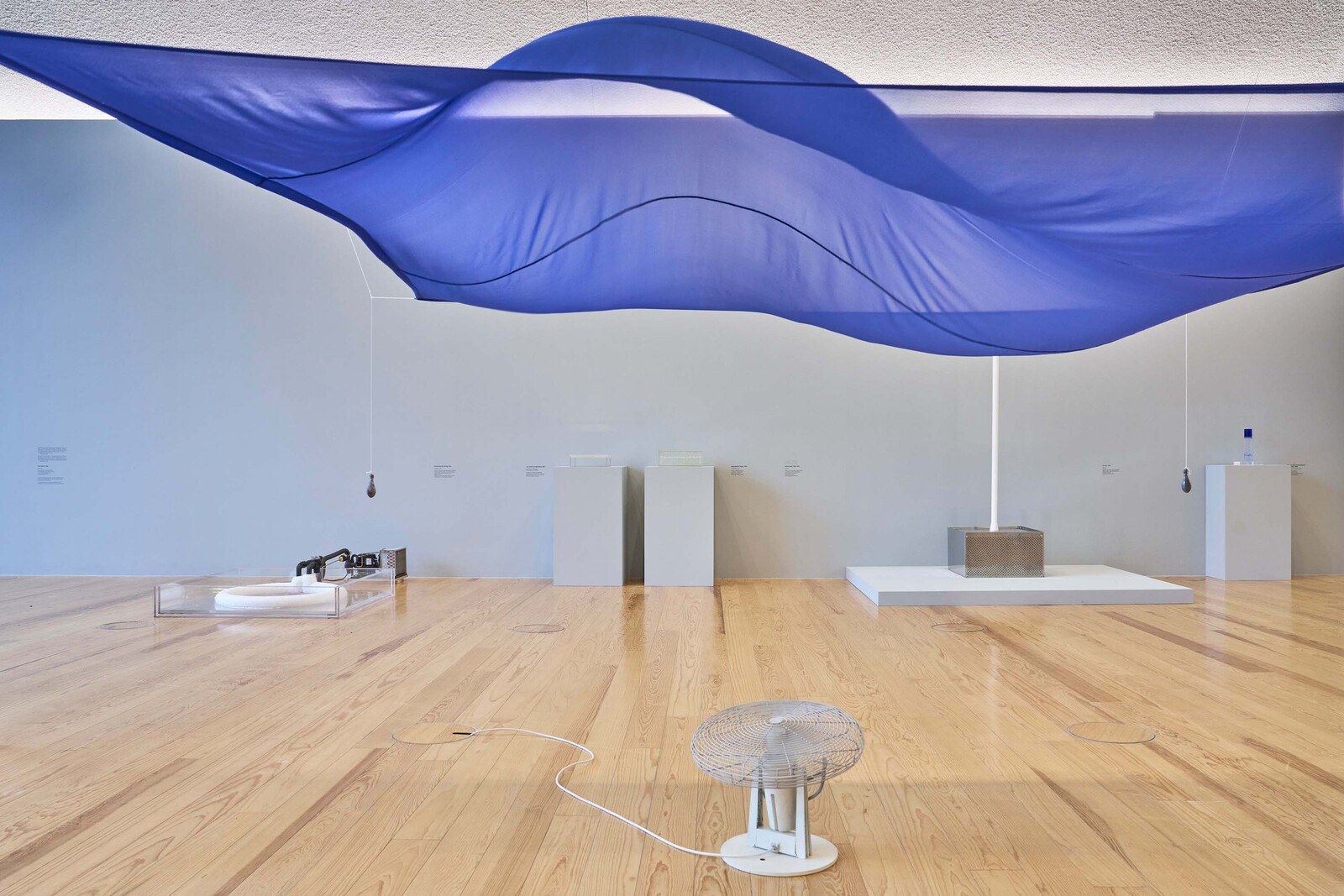 Grids, dots, energy, and US 1960s (post-)minimalist discourse – with Haacke, these factors congealed into elegantly stripped-down processual setups, distributed here across the brightly daylit first space in the exhibition: a piece of chiffon floating in mid-air (Blue Sail, 1964–65), a free-standing pole of ice-covered steel (Ice Stick, 1966), a Plexi box with water inside (Large Condensation Cube, 1963–67), a white room with light bulbs going on and off according to visitor movement (Photo-Electric Viewer-Controlled Coordinate System, 1968), a heap of grass-covered earth (Grass Grows, 1969), or a photograph of seagulls fighting over bread fed to them by the artist (Life Airborne System, 1968). “A ‘sculpture’ that physically reacts to its environment is no longer to be regarded as an object,” Haacke wrote in 1968, quoted by curator Jack Burnham in the programmatically titled Artforum essay “Systems Esthetics” that same year.1