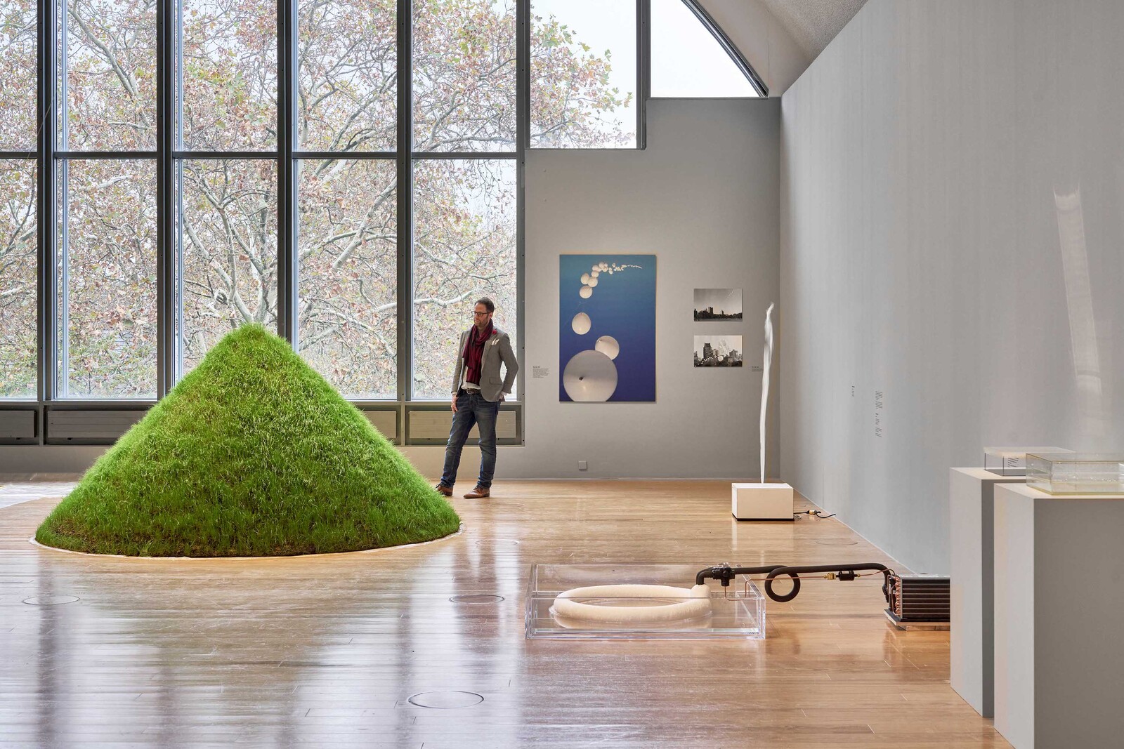 If you had never encountered Hans Haacke’s work before, then you might think, upon entering the first room of this exhibition: “Oh nice, look! How pretty and interesting. There are his op art-influenced canvases of the early 1960s, and the physical and organic systems (balloons floating, plants growing) of later in the decade.” In the next space, you might think: “Holy moly! Something must have happened around 1969/70, that guy really had a moment of political awakening—look how fiercely he’s attacking the powerful in the art world.” At which point a Haacke expert might pop up and tell you that of course there is a peculiar, logically imperative connection between those earlier experiments in form, system, and process and the later work that would become the paradigmatic form, system, and process of institutional critique. This expert would have a point. But the desire to always explain that connection as a logically inevitable and linear one is also a bit suspicious and needs to be probed—for which this retrospective (which travels to Belvedere, Vienna) is a welcome occasion.