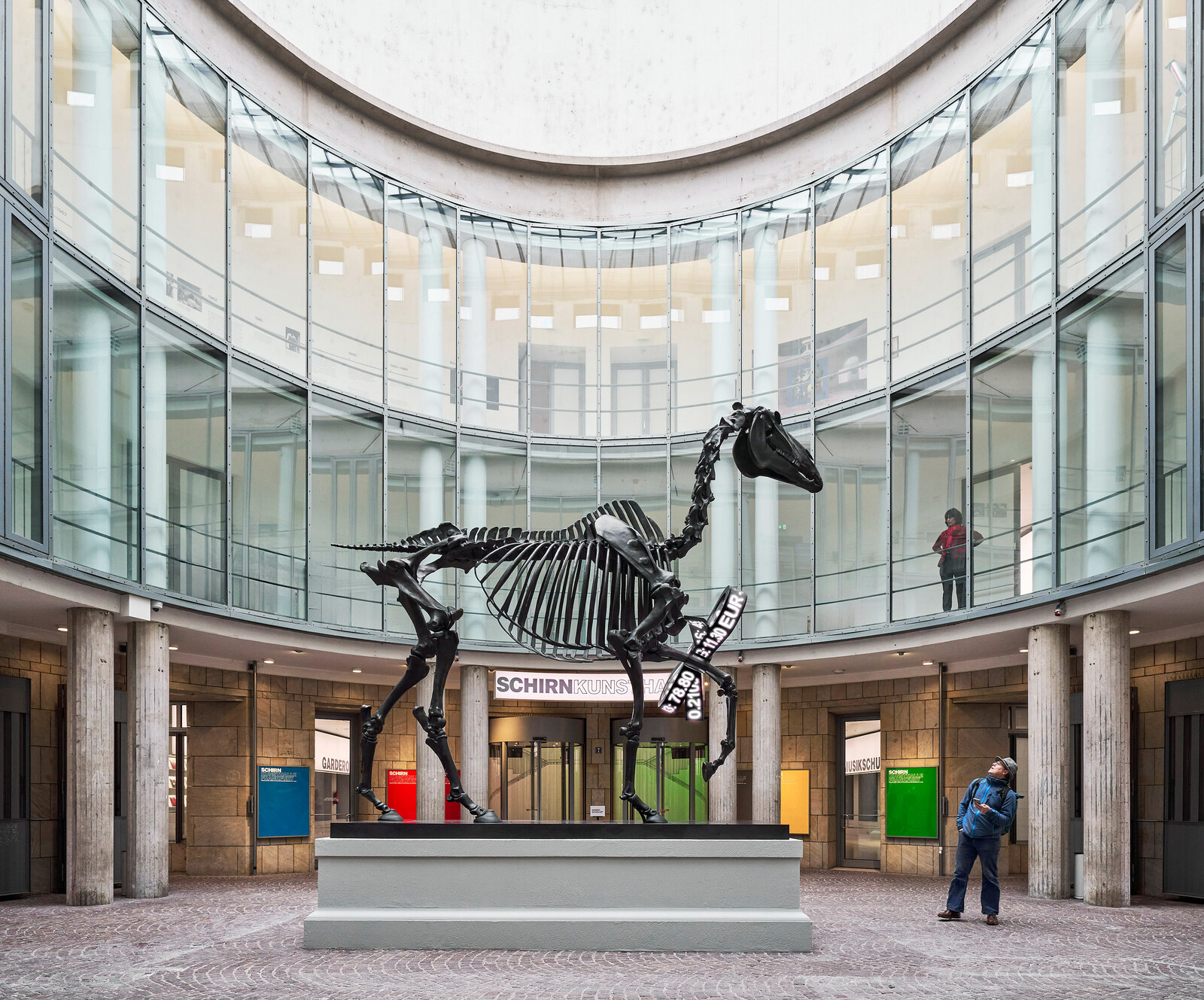 The above thought experiment would not happen in actuality—before stepping foot in the first room, you have already encountered two later works—and so the show, curated by the Schirn’s Ingrid Pfeiffer, mimics the impossibility for anyone even vaguely aware of Haacke’s practice of seeing the early work without having in mind what is to come. In the rotunda at the museum entrance is the bronze cast of a skeletal horse. Originally conceived for the Fourth Plinth in London’s Trafalgar Square, it refers to the reason that plinth remained empty in the first place: an equestrian statue of King William IV, commissioned after his death in 1837, never came into being due to a lack of funding. Larger than life, Haacke’s cast is inevitably reminiscent of a dinosaur fossil. What’s more, an electronic ticker ribbon around its left front thigh gives a live display of the current prices at the Frankfurt Stock Exchange. Gift Horse (2014) adds up to a pretty good joke: if there’s not enough money to realize the gigantic equestrian statue celebrating a fossil, ossified institution, let’s do a skeletal version and present it with a gift ribbon that hints at where the money has gone instead.