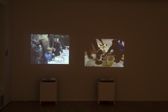 Some of the works depict animal slaughter, a subject that can provoke aversion and disgust, despite the fact that innumerable animals are slaughtered daily to feed humans’ carnivorous tastes. This hypocritical attitude was at the center of Where is the Line?, Franc Prug’s 1998 performance at the Škuc Gallery, presented as video documentation. In the back room of the gallery, the artist butchered a calf with the assistance of a professional butcher, while a vast majority of the visitors at the opening feasted on a mostly meat-based buffet in the adjoining room. For the opening night of “Heavenly Bodies,” Sven Stilinović remade his 1993 performance Geometry of Bloodthirstiness: he brought a whole roast lamb to the opening, cut it up in front of the audience, and offered it to them with bread and wine. They ate it all.