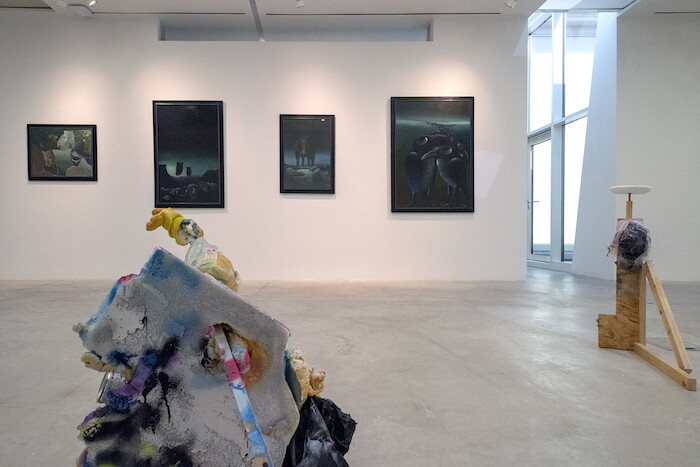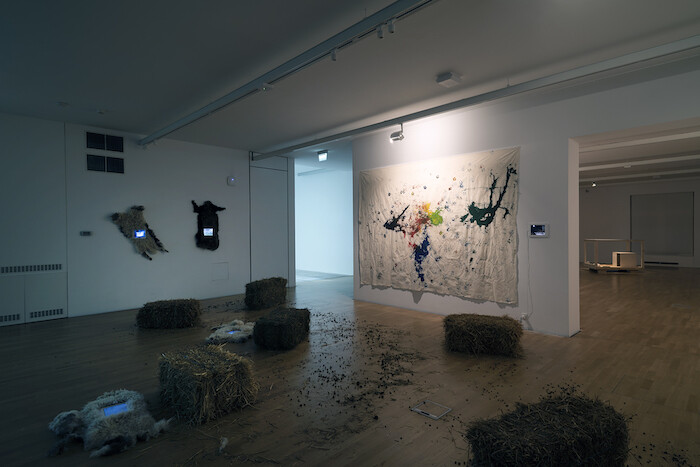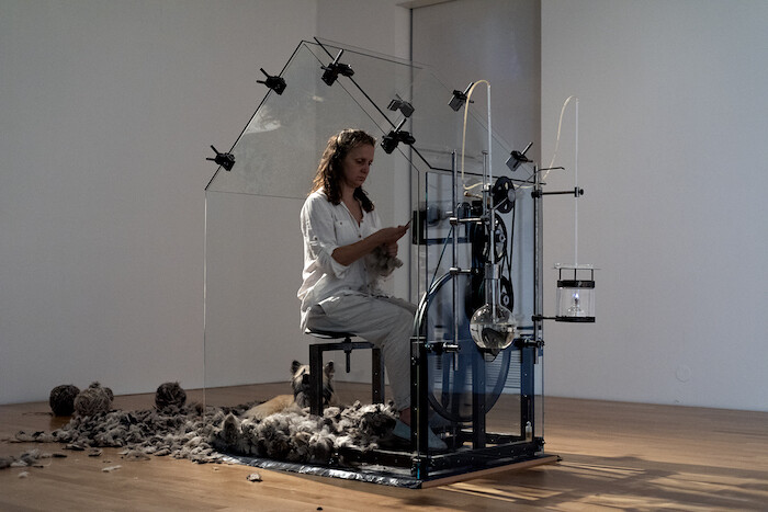 Several works in “Heavenly Beings” explore potential synergies between humans and animals. Maja Smrekar’s Hybrid Family (2016), for example, is a series of black-and-white photographs documenting a three-month performance during which the artist trained her body to produce breast milk, which she fed to a puppy she was living with. Correlated in content and form is Opus et domus (2018), in which Smrekar spins yarn from dog and human hair on a spinning-wheel. Broaching gender, family values, and the position of women as mothers, both projects reflect on the processes of, and differences produced by, what Giorgio Agamben has called the “anthropological machine.”2