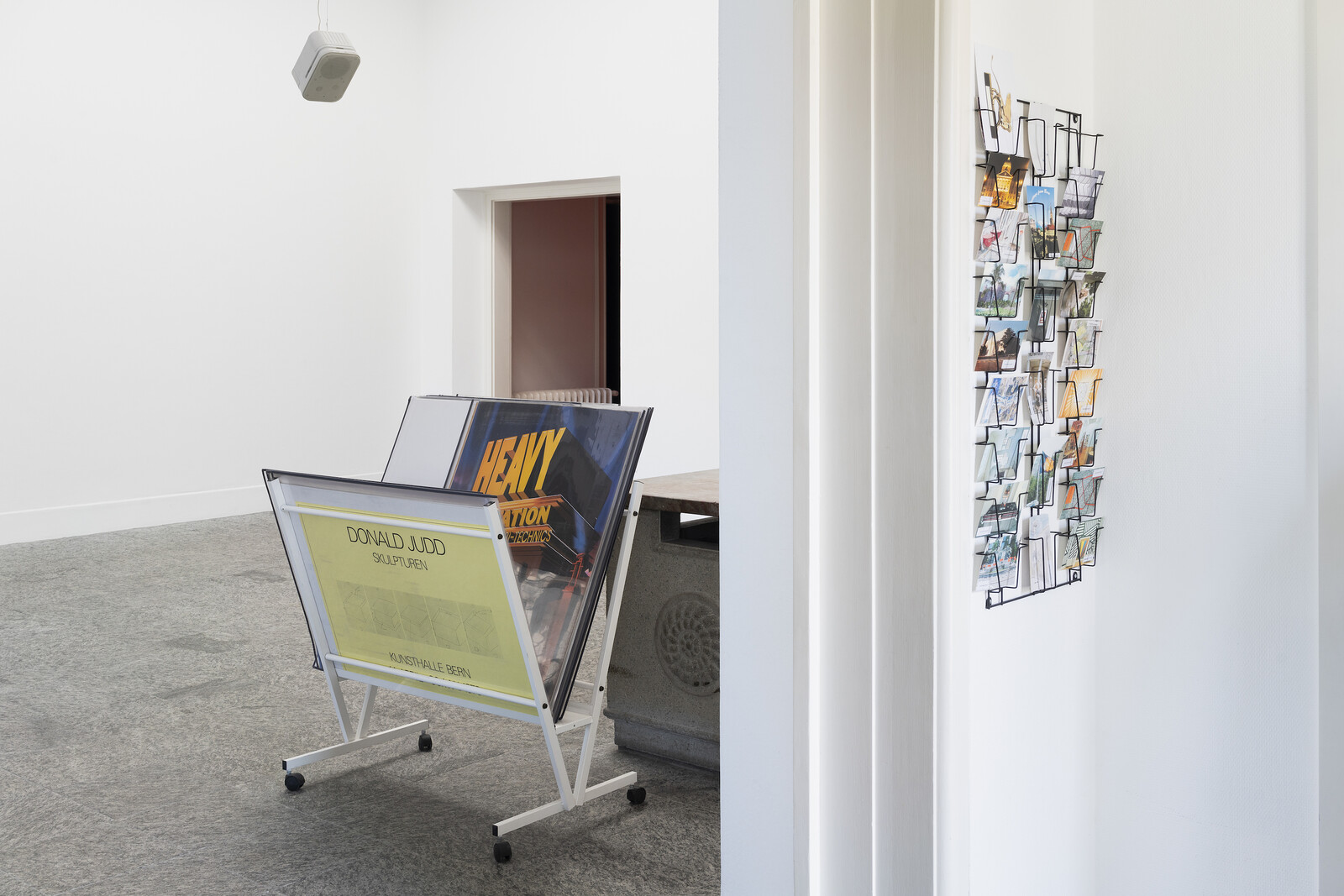 In “Heavy Rotation Infra-habibi-technics,” makeshift infrastructures such as these evoke motion and traffic as well as incidents and happenings that are furtive, off-ledger, or premised on informal networks. These unmoored objects—available to touch and vulnerable to pilfering—are presented in ways that resist easy attribution to the contributing artists, attesting to a different logic of exhibition-making. This reluctance to discretize the works further manifests in the illustration of weather patterns that substitutes for a labelled floor plan, indicating a merging of indistinct “atmospheres.”