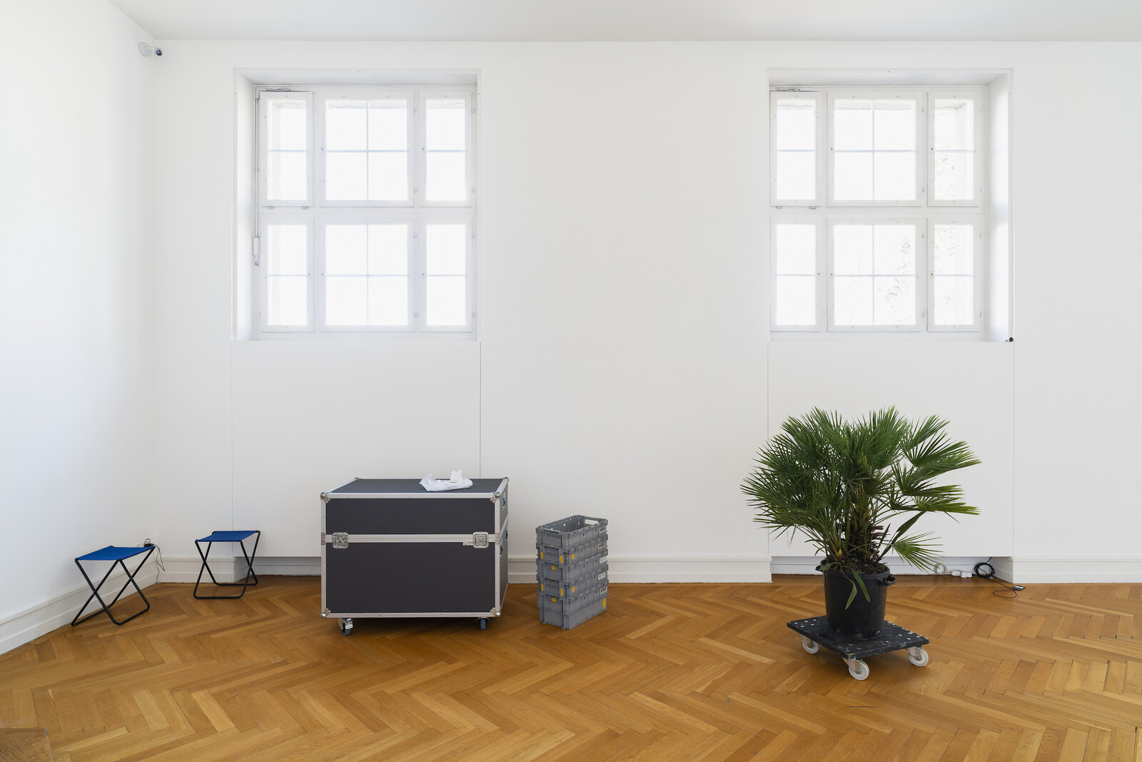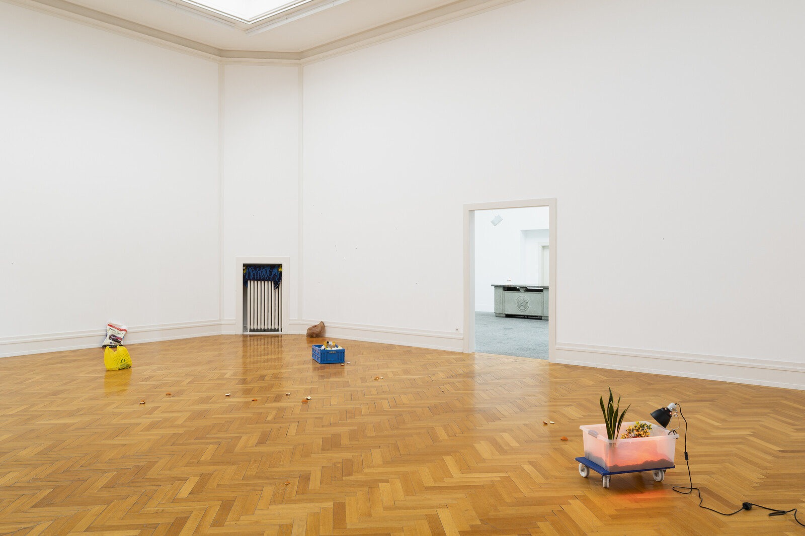 Unassuming objects—such as grocery cartons, essential supplies, orange peels, shopping carriers, polythene bags, suitcases, a towel, and a lighter—occupy a large hall of Kunsthalle Bern. Elsewhere in the space, a discarded scratch card lies on the floor beside stacked chairs and potted foliage on wheels. Assembled by artist duo Valentina Ornaghi and Claudio Prestinari, these tableaux stage a material sensorium of the ubiquitous. Fragments of Campo del Cielo meteorite are dispersed across the walls in various permutations as well: a cosmic extension of the morsels that constitute the ordinary.