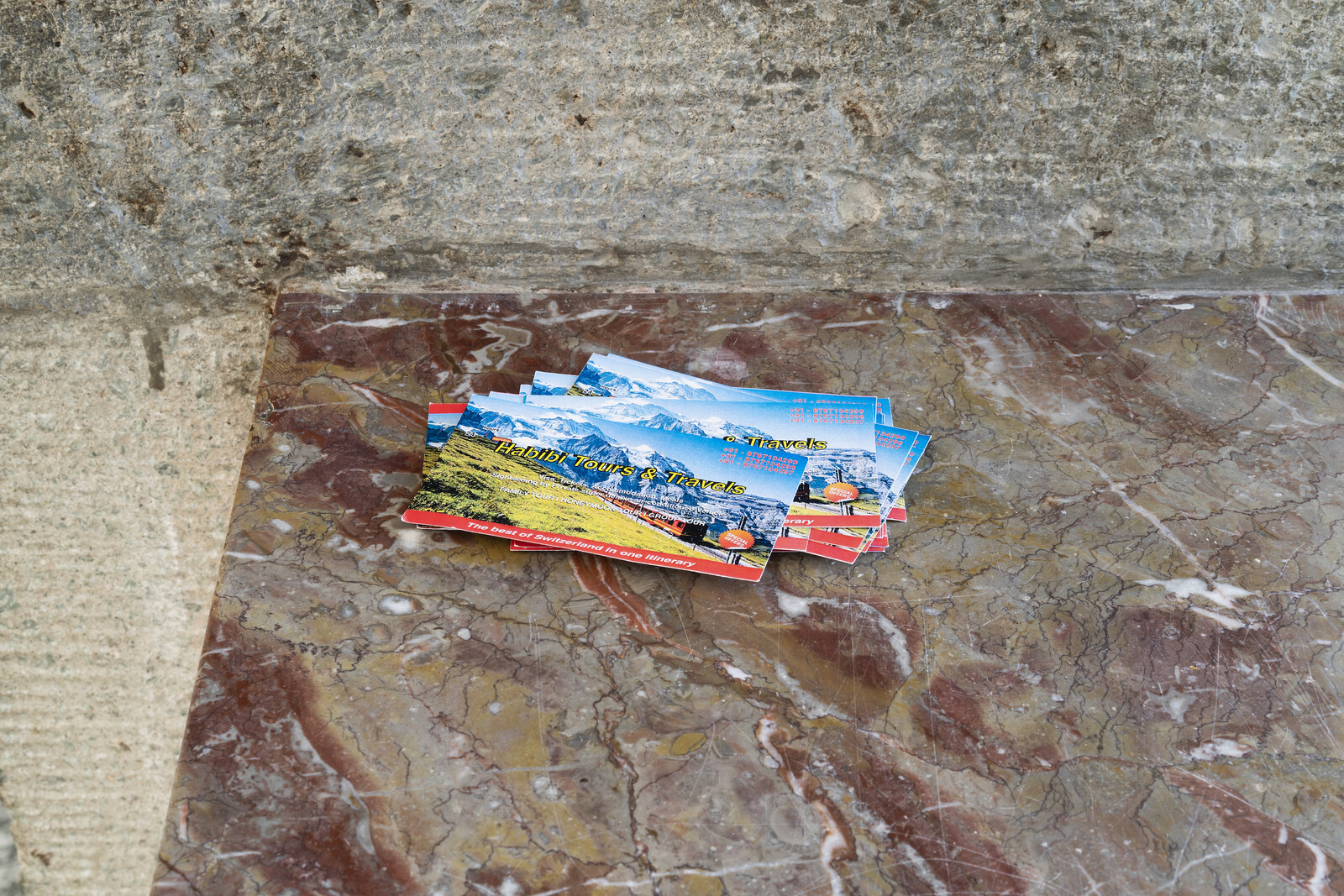The reference is supported by the pamphlets from “Habibi Tours and Travels” scattered throughout the gallery. Carrying an idyllic image of the country as a representative graphic, they advertise “the best of Switzerland in one itinerary.” But a Brown body can only access this imaginary through long periods of waiting in queues at the visa office, alongside considerable expense, intense scrutiny, and bureaucratic rigmarole. The poster on Surana’s T-shirt further ascribes horror to an otherwise romantic musical through its choice of a noir syntax; perhaps a similar horror for instruction animates the impulse to jump the queue in Passport Party. That the T-shirt is sold as merchandise at the museum’s gift shop and online complicates its position as an “artwork.” In refusing this status by expanding into the market through reproductions, the work seeks other, more viable forms of persistence.