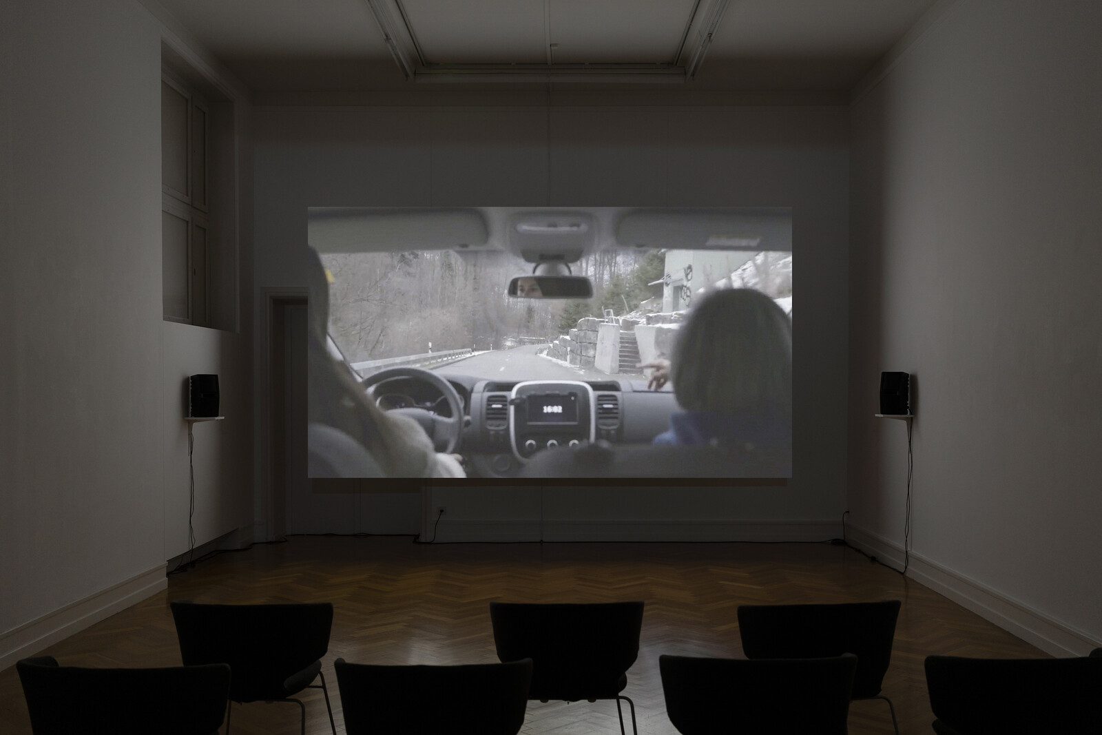 The orange peels, for instance, refer to a film shown in an enclosed space on the floor below. In Cow Heaven Brawl Cloud (2023), the artist Laura Nitsch films two women driving a car on Alpine roads through turns and twists indicated only through subtle, practiced motions of the hand. At one point, one of the women peels an orange before they both consume it. These peels are dispersed across the gallery’s floors and tables in a cinematic spillage of index.