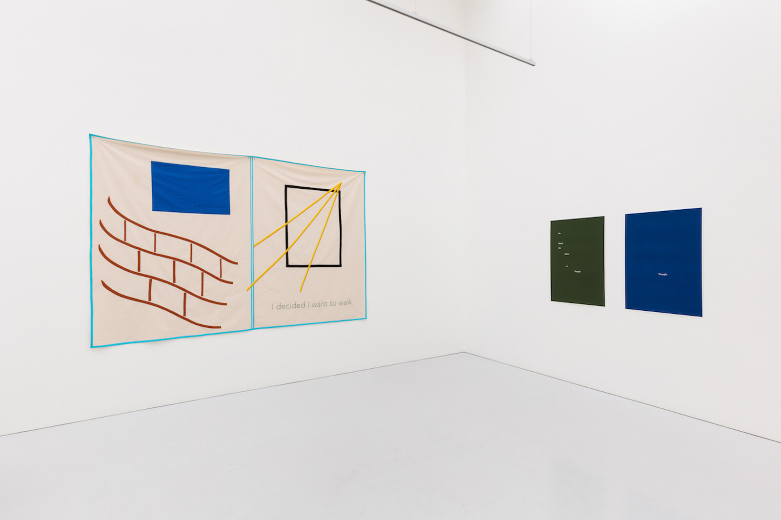 “I Decided I Want to Walk” showcases Cammock’s ability to condense sprawling, complex thought into moments of keen clarity. The broad canvas banner which serves as the exhibition’s namesake stitches an iconography of the idler: a cerulean rectangle, Wysing’s curved brickwork, and streaming sunlight gather the show’s imagery into precise forms, framed and divided by a slim turquoise border. The video’s “hunt for that light shaft of nothingness, in order for somethingness to scratch the back of the mind” finds its object in the single yellow beam that breaks the frame.