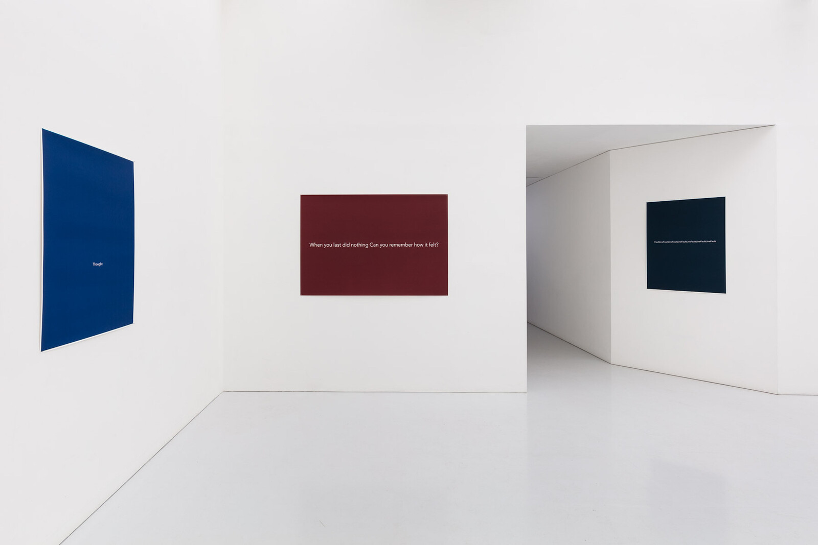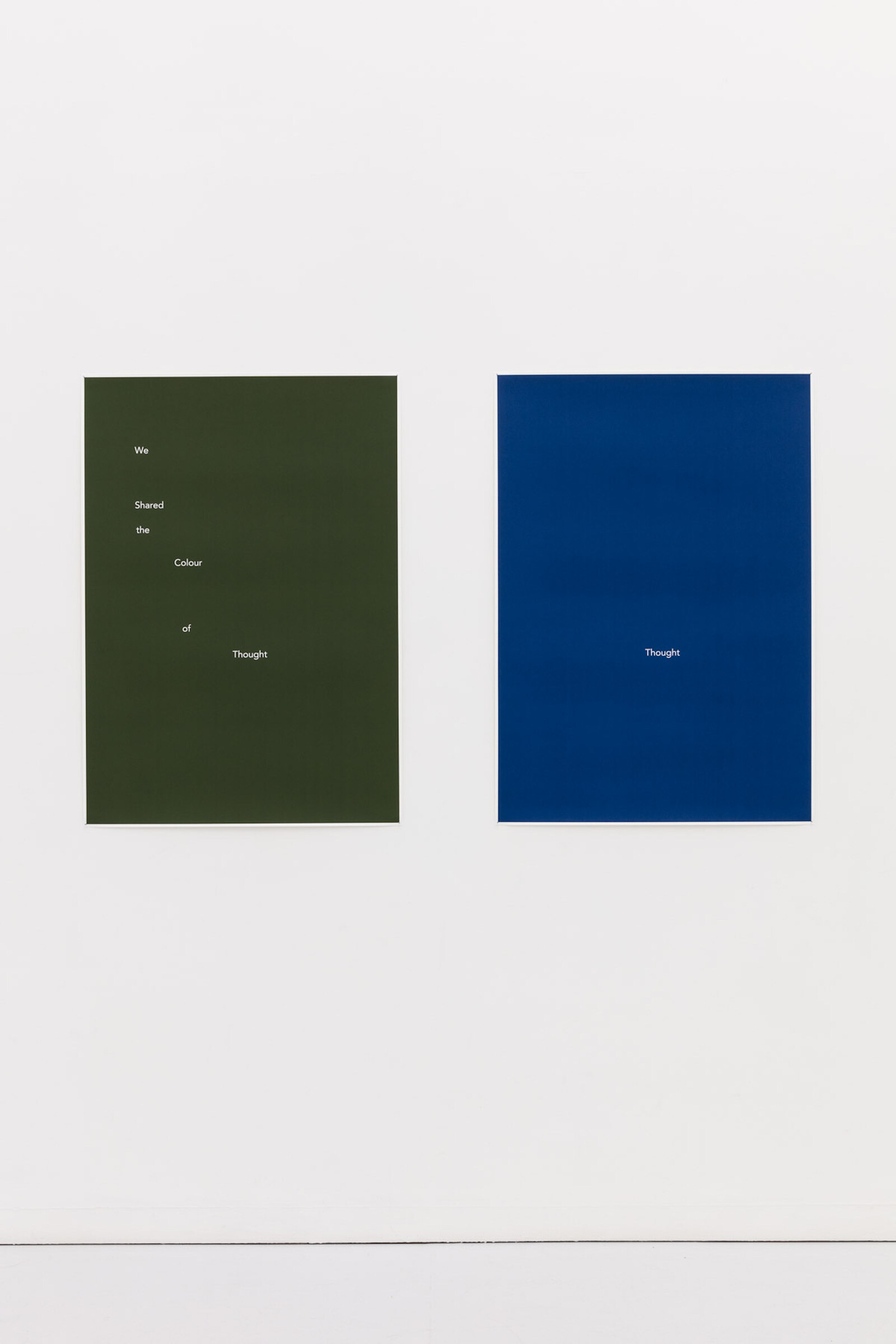 Beyond the compact screening room at the exhibition’s entrance, two printed billboards (originally installed at a short-lived March exhibition at Wysing) line the walls of the light-filled main gallery, interspersed with a selection of new screenprints. Both series feature irregularly spaced white text against a monochrome background (crying/ is/ never/ enough; We/ Shared/ the/ Colour/ of/ Thought), and endeavor to rewrite the narrative of laziness, and to question its motives. Who is entitled to idleness? Who is expected to maintain productivity? For whom, in this moment, is idleness an applauded civic duty, and for whom is it a shirking of responsibility? Across the exhibition, the questions posed by Cammock’s billboards are drawn into the present tense; in these times, Can you remember when you last did nothing? is more likely than usual to be met with an affirmative nod.