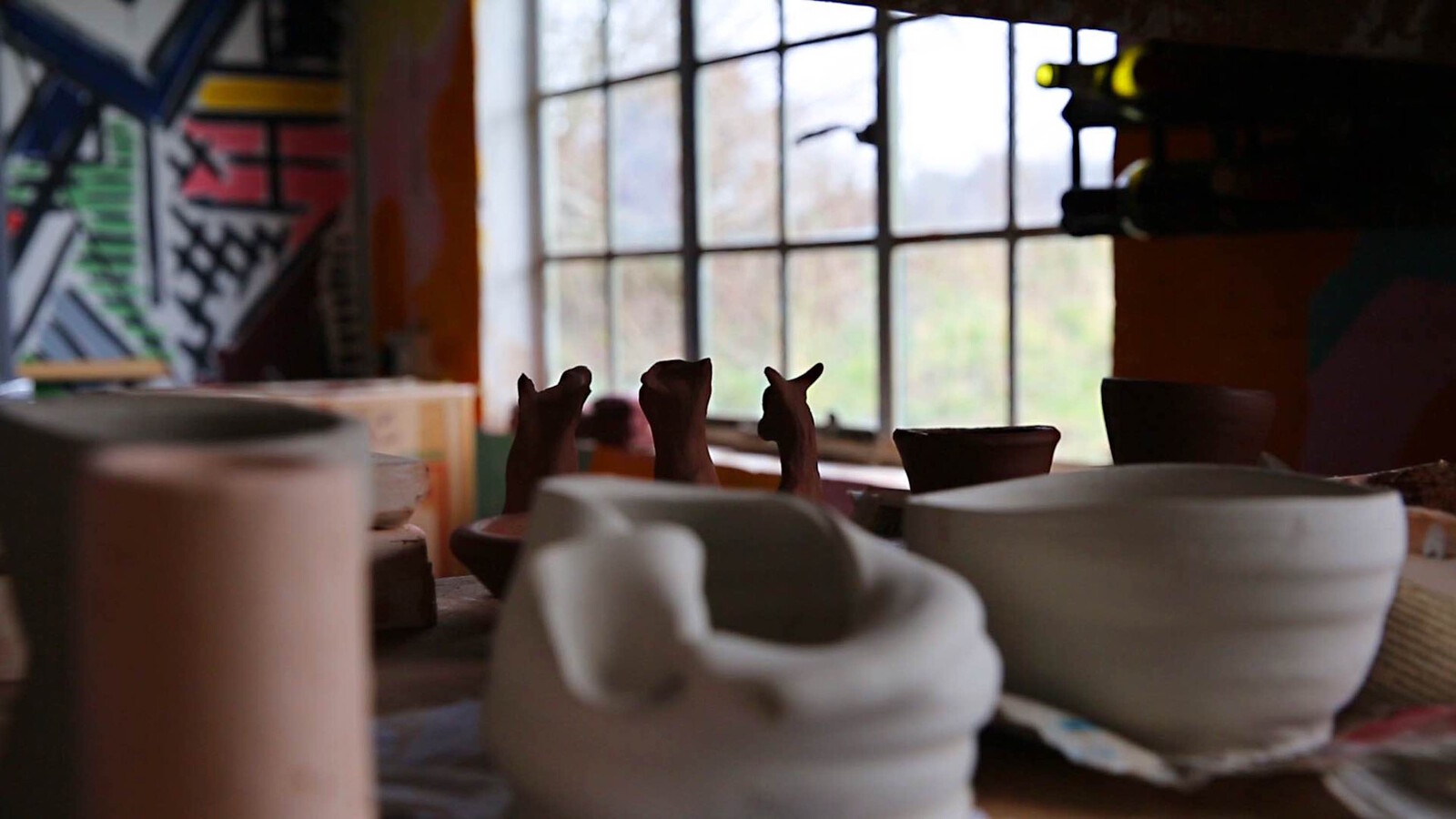 I first encountered They Call It Idlewild (named for a playhouse in Lucy Maud Montgomery’s 1908 novel Anne of Green Gables) on the screen of my laptop, streamed online due to the early closure of the show at Wysing. In the gallery, removed from the distractions of multiple tabs, unstable connections, the commands of pause and play, I enter the dark room to find the video playing on loop. A mosquito clings to a glass pane, a chimney exhales a steady stream of fog, a hand propels a bare pottery wheel anti-clockwise, then clockwise, over and over. This is the work on its own terms, indifferent to the presence of the viewer. I forget where it starts or finishes, aware only of the point of my initial encounter, which loops back around to meet me. “Bewilderment can be essential,” reasons Cammock’s voiceover, “yet we still move, tripping, stalling, with ever-grinding movement, either forward, backward, or sideways.” It is hard not to get swept into the video’s eddies, its anti-teleological rhythm.
