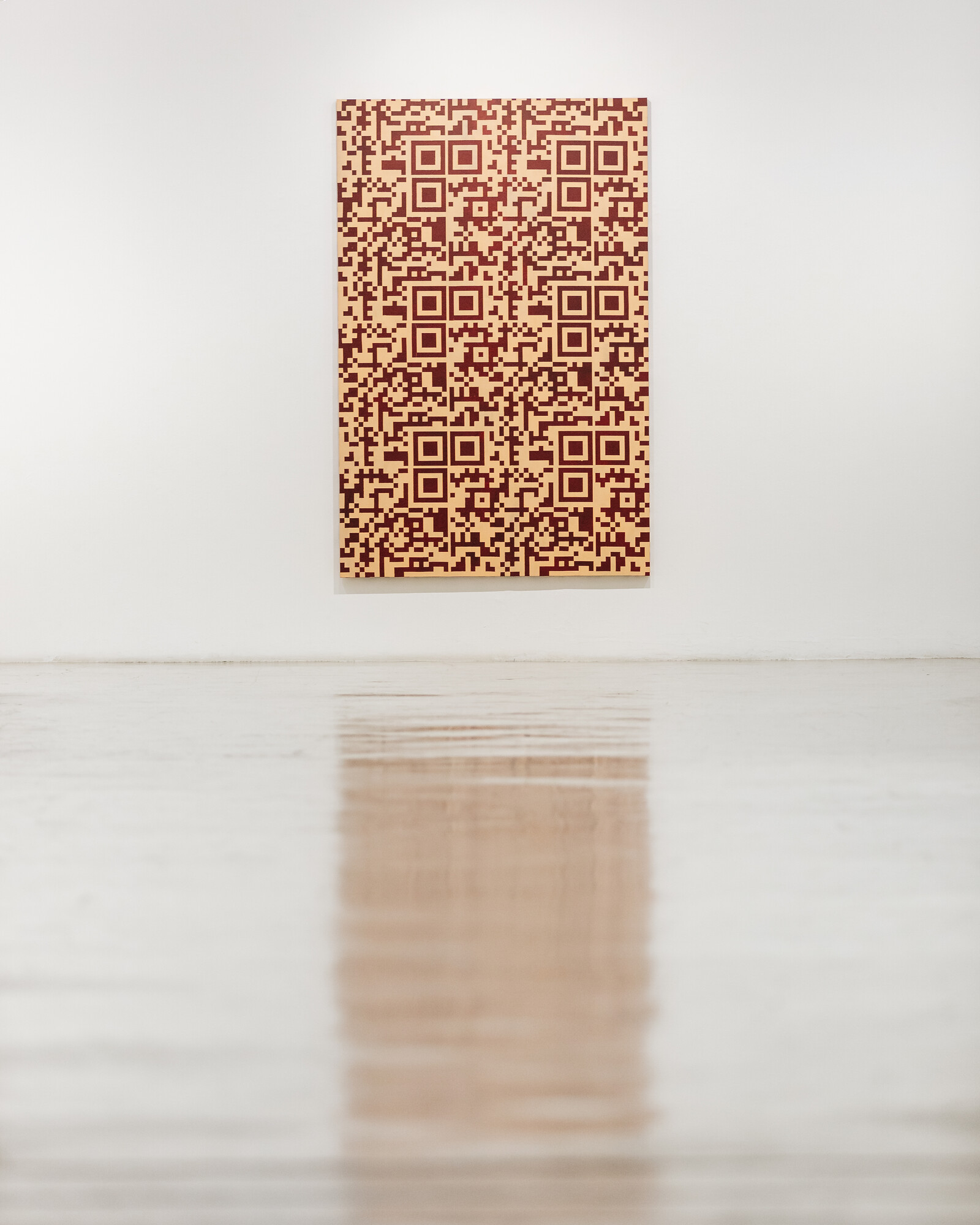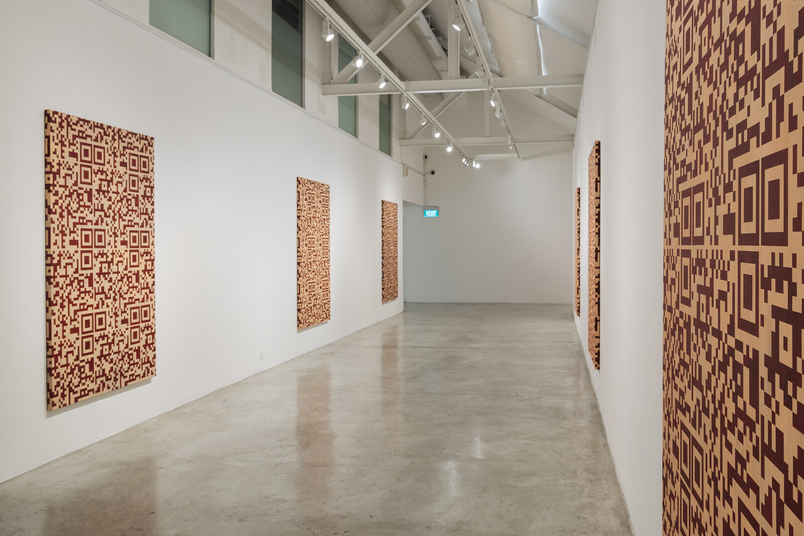 Grids appear elsewhere in the show. Safe Entry (Version 2.0 – 2.7) (2020) comprises eight tall panels of acrylic paintings modelled after a national digital check-in system called SafeEntry, which logs visits by individuals to public places and hotspots in Singapore using QR codes. With their motifs of square cells and pixeled formations, picked out in brown against a yellow background, Chong’s painted—and repeated—QR code is enlarged to the point of abstraction, which opens it up to a range of interpretations: a house, a prison, a computer chip, a piece of machinery. In doing so, it suggests that the cell is a symbol of contemporary life: isolated, immobilized, and under surveillance. As warlord politics, artificial intelligence, and Covid-19 encroach on everyday reality, and while compelling visions of a better future remain distant, Chong’s works feel timely in their suggestion that the mind is its own place, and in itself can make a heaven of hell, a hell of heaven.