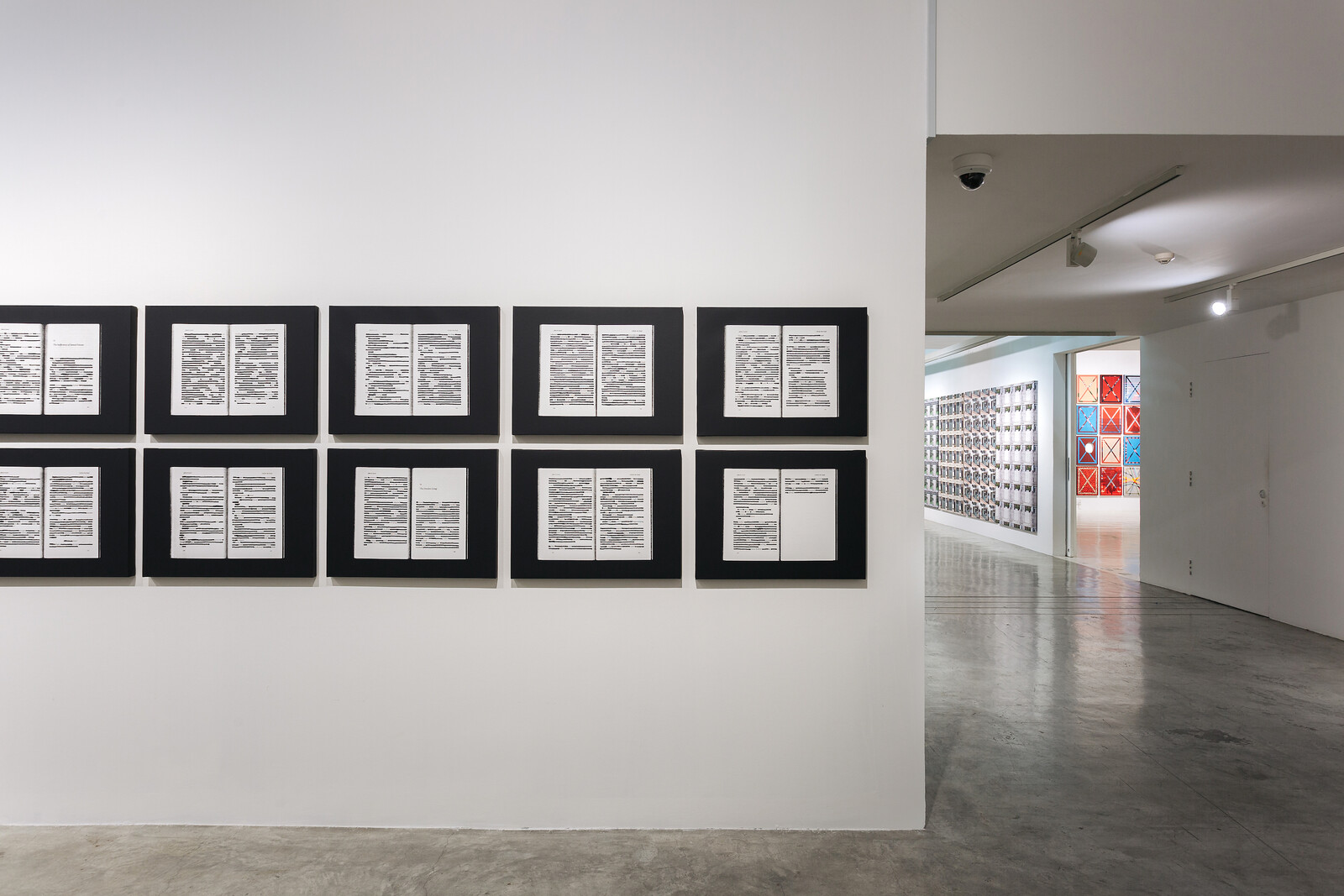 “PEACE PROSPERITY AND FRIENDSHIP WITH ALL NATIONS,” declares a wall piece mounted beside the entrance to Heman Chong’s solo show at Singapore’s STPI. Written in an all-caps, dripping black font reminiscent of leaking bodily fluids and suggesting violence, the arresting phrase—which lends the exhibition its title—is lifted from a British coin minted to commemorate the UK’s formal withdrawal from the European Union on January 31, 2020. Direct and ambiguous, official and hilarious, the piece combines the playful language of conceptual art with the immediacy and seriousness of contemporary history. In doing so, it sets the tone for an exhibition that brings into focus the artist’s powerful use of appropriation, abstraction, and repetition in addressing the restrictiveness and complexity of the present.