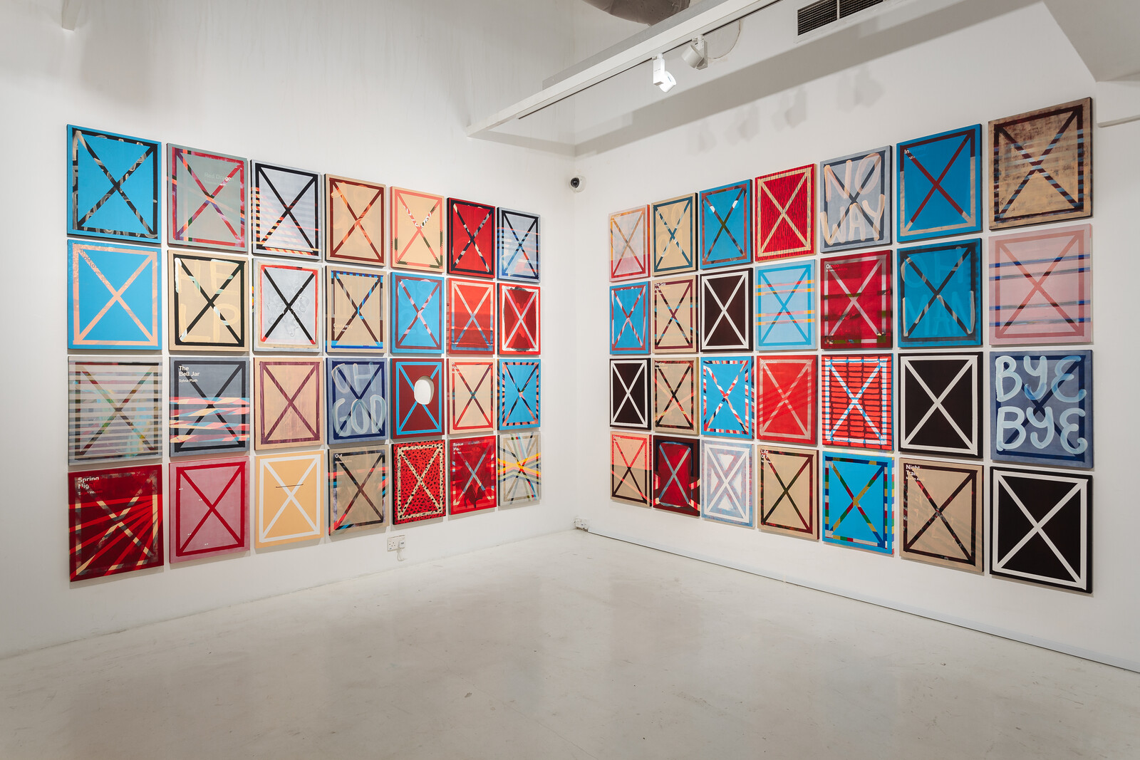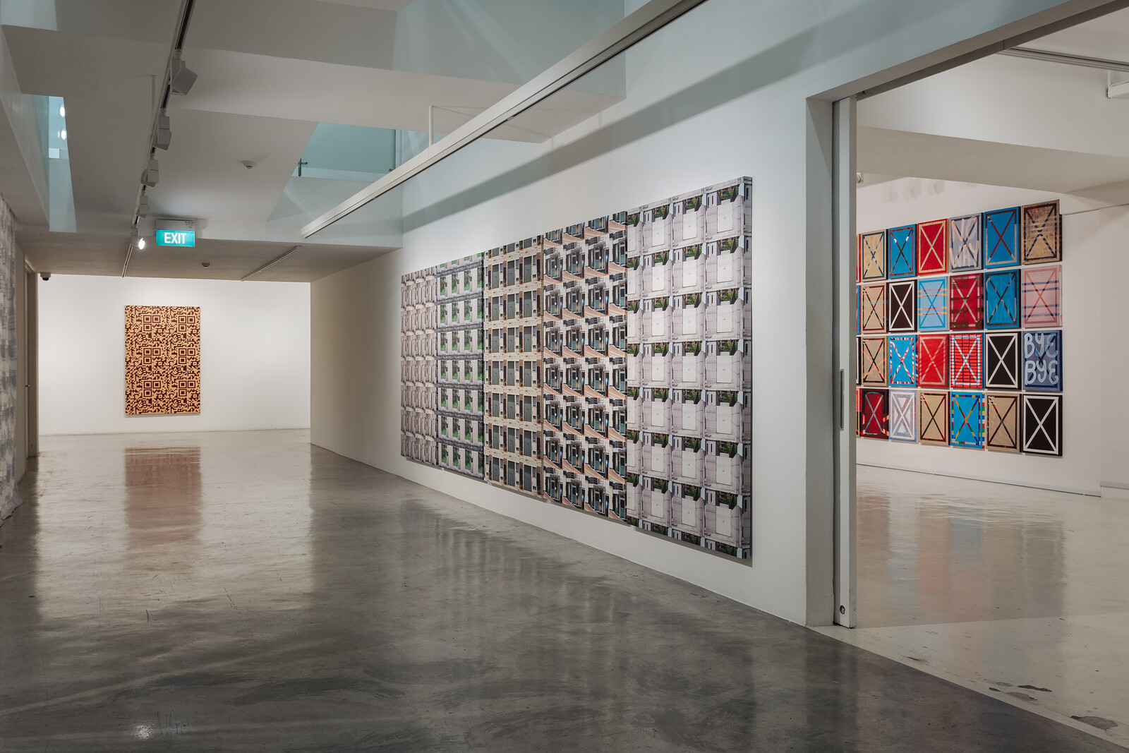 The latent geometric formalism of these works comes to the fore in the artist’s The Circuit Breaker Paintings (2020), a series of paintings in red, gray, beige and blue that are hung—again in a grid formation—across two walls. Chong painted a work on each of the 56 days of Singapore’s nationwide partial lockdown, imposed in a strategy known as a “circuit breaker,” in the early summer of 2020. Each painting adopts the same outline: a rectangle divided into quarters by a cross. These X-shapes may bring to mind the tape used across the city to prevent people sitting on seats at dining outlets, malls, parks, and cinemas, in order to ensure social distancing. Working against this standardization, however, is the hand-painted nature of the work, including occasional phrases (“OH GOD,” reads one), which convey his own anxious response to the pandemic. And yet there is something oddly cheerful about Chong’s ubiquitous Xs—the vibrant colours and decorative pattern convey a sense of pluck, as if they are determined to carry on, no matter what.