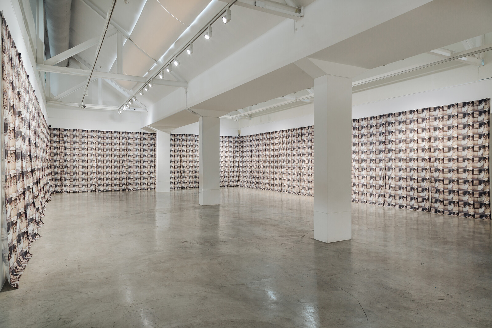 As the repeated pages in Call for the Dead indicate, the grid—with its flattened, geometric, and ordered structure—is a motif of this exhibition. In the 2018 photo series “Foreign Affairs,” for instance, Chong has photographed the back entrances of embassies and printed them in a grid formation on canvases and on curtains, where regimented sequences of images depict windows, fences, doors, mirrors, gates, brick walls, and barbed wire overgrown with plants. Out of these repetitions and variations emerges the sense of an architectural type: the artist here seems interested in bringing to light how the mythical function of embassies, as symbols of protection and power, are physically constituted.