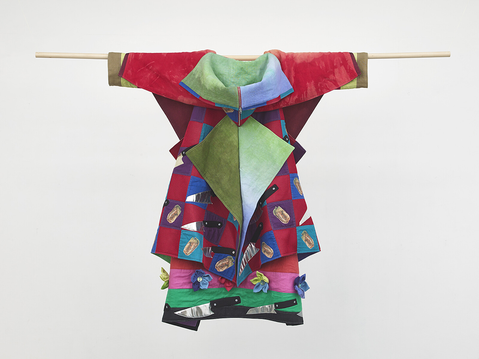 Two of Xa’s brightly colored robes hang opposite each other, suspended from the ceiling. The open folds on the front of Princess Bari fall in concentric half circles, made of linen hand-dyed in shades of coral, chartreuse, and sky blue, the hues seeping together to create a riotous sunset. The back is festooned with stitched knives and a cascade of rainbow ribbons running down the back, each ending with a photo printed on cotton of kimchi. Kimchi rites, kitchen rituals cuts a more angular form with its sharp lapels, but its palette is no less exuberant. Here, a vibrant checkerboard background is affixed with knives jutting at odd angles and more printed cotton images of kimchi, while a neat row of fabric flowers encircles the hem.
