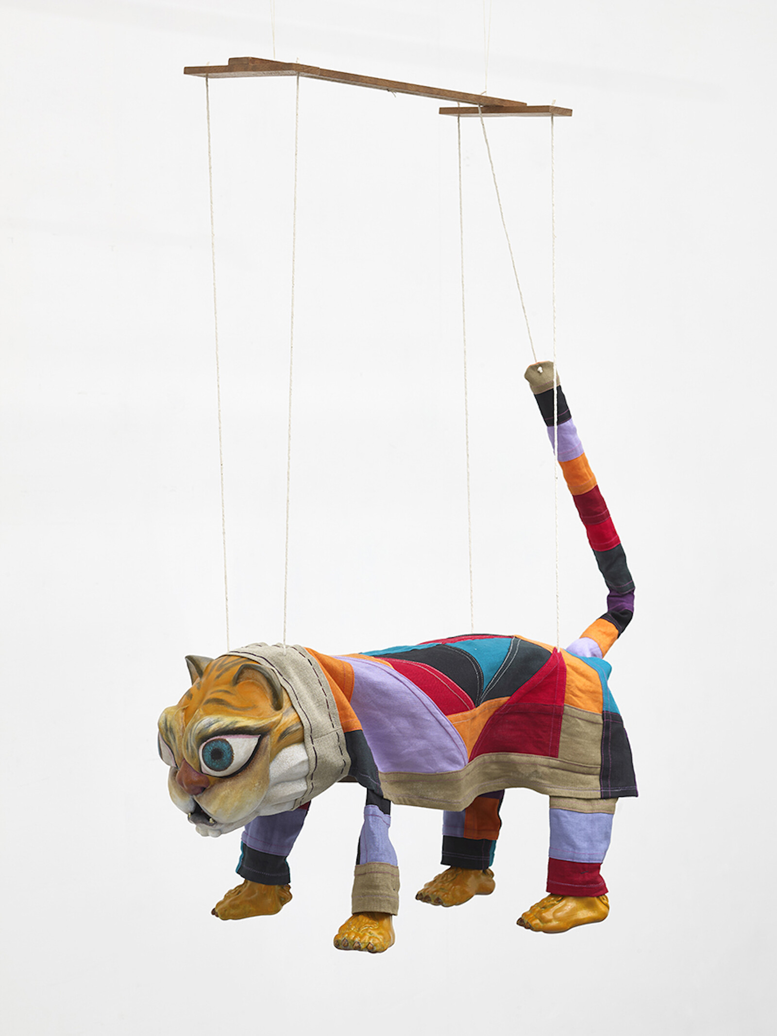 There’s a spot in the two-person exhibition “House Spirits” from which Hernan Bas’s large-scale painting Disco Demolition Night (all works 2022) appears framed by Zadie Xa’s shamanic robe Kimchi rites, kitchen rituals, hanging near the front of the gallery, and her kaleidoscopic constellation in stitched linen-and-denim, Seven full moons, on the back wall. In this sightline, the artists seem an unlikely pairing: the content and references of Xa’s fabric works draw on her Korean heritage while Bas’s acrylic paintings are rooted in white American pop culture. In bringing these two artists into dialogue, however, this exhibition foregrounds the way each traffics in a kind of visual folklore. The tension between the former’s new, hybrid identities and the latter’s melancholy depictions of the demise of a monolithic culture reflects changing social dynamics.