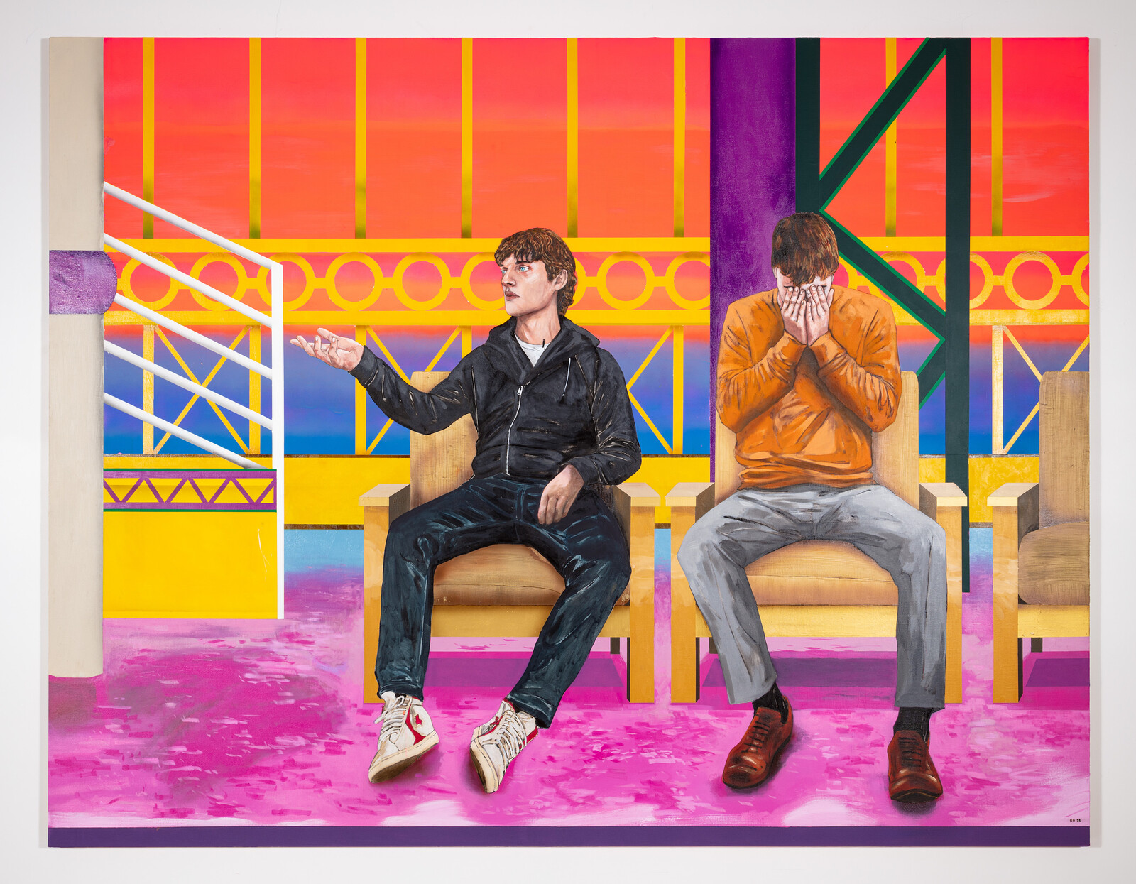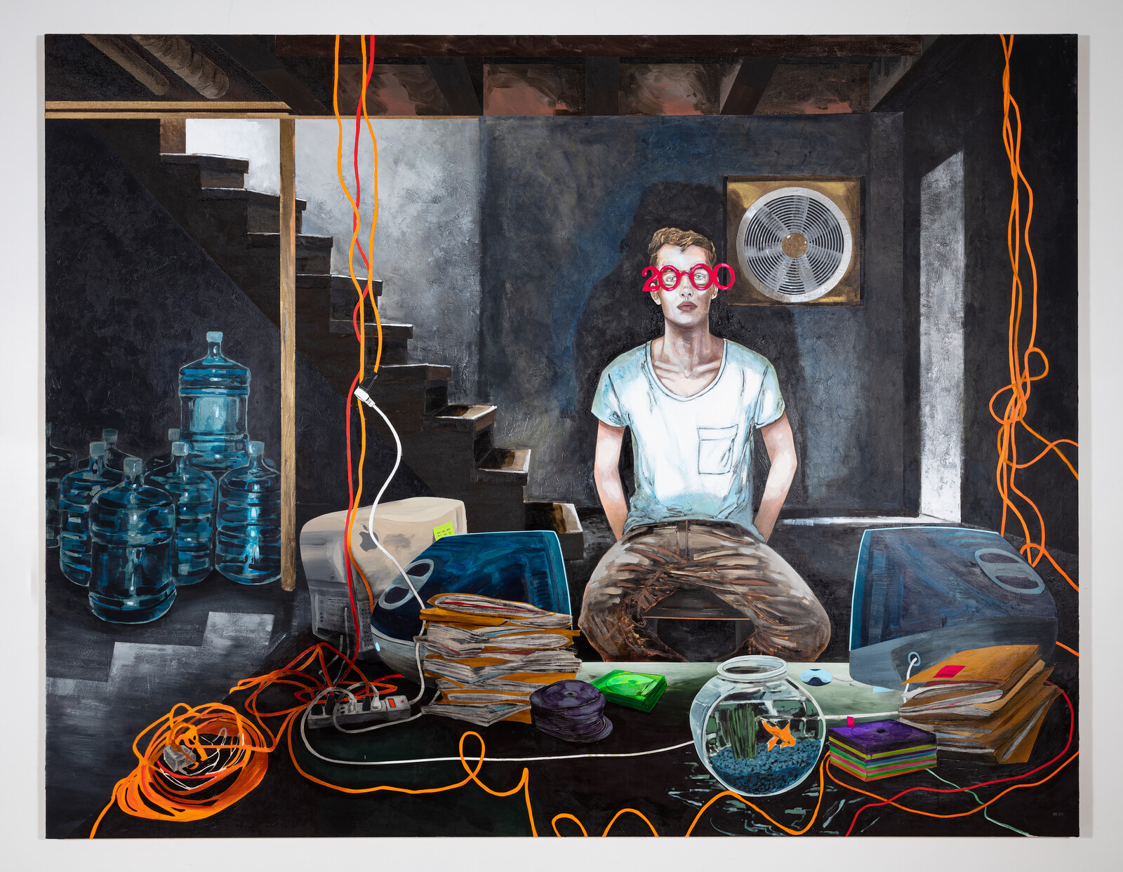 Diagonal from here, Bas’s December 31st, 1999 (11:58 pm) shows another young white man, sequestered in a dark basement, wearing kitschy “year 2000” glasses as he awaits the turn of the millennium. A pair of Bondi Blue iMacs anchors his desk amid a tangle of cords, while a stack of full water jugs in the background underscores the apocalyptic feel of the scene. With their pointed cultural touchstones, Bas’s paintings at first feel firmly rooted to a historical moment: the end of disco, but also of LPs; the precipitous turn of the new century; and in Ambush Television, the era of shocking personal reveals on daytime television. All of Bas’s paintings feature themes of ending and devastation: in this conversation with Xa’s works, they augur the downfall of white male hegemony.