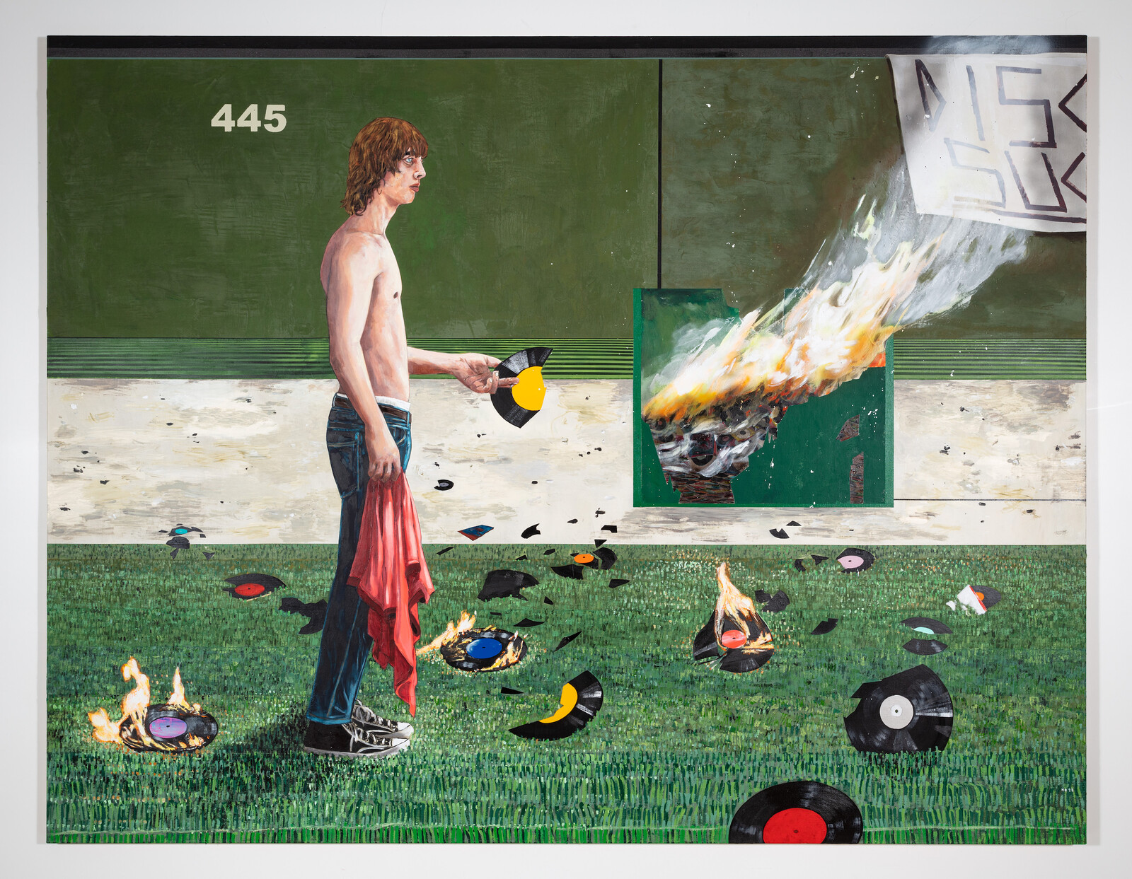 In contrast to Xa’s distinctly female purview, Bas’s paintings in the exhibition are populated solely by young white men. One of three monumental paintings in the exhibition, Bas’s Disco Demolition Night, depicts one such man standing shirtless on the edge of the outfield grass near the warning track on a baseball field. His expression is distant, and in one hand he insipidly proffers a broken record. Discarded records litter the ground around him, some ablaze, and nearby is a literal dumpster fire full of records. In the upper right corner of the canvas, the edge of a banner reading “Disco Sucks” trails off into the space outside the painting. Bas’s referent here is the notorious night in July 1979 on which an ill-conceived baseball promotion at Comiskey Park in Chicago ended in a fully-fledged riot. While this incident is often misleadingly credited with killing disco’s popularity, it can also be seen as a sort of proto-Trumpian instance of white male rage against a perceived threat to their cultural dominance.