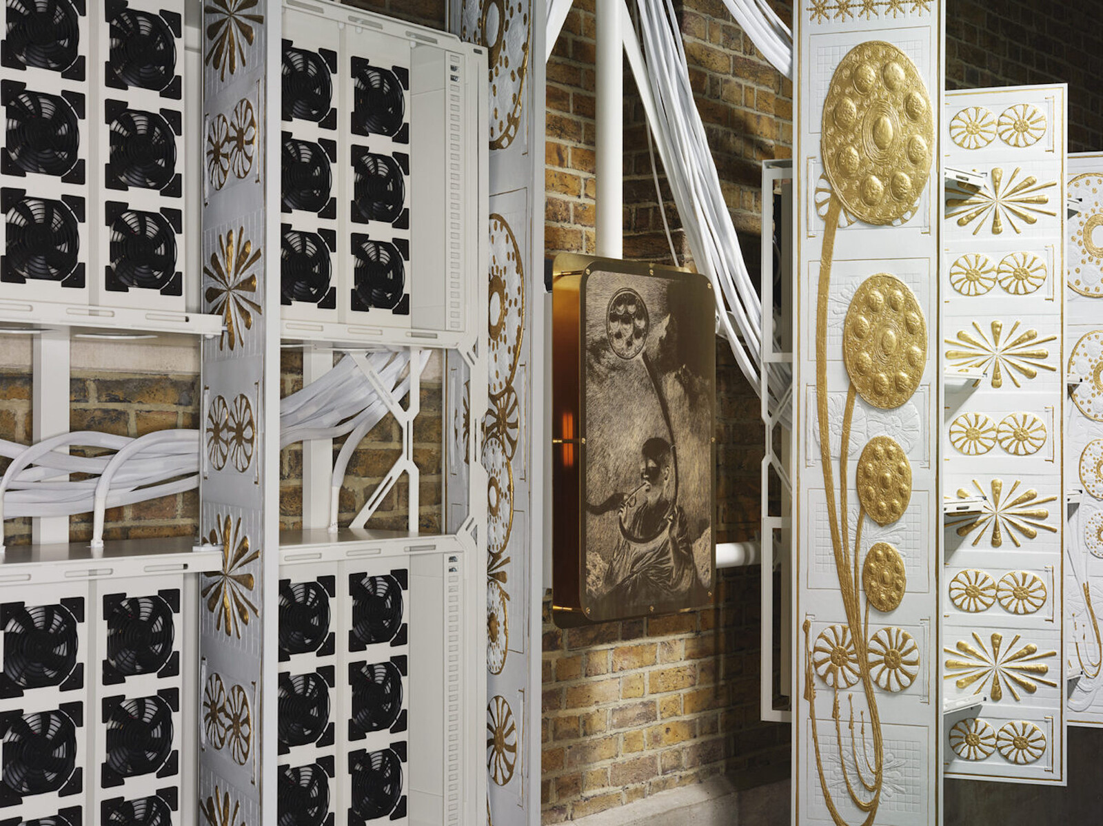 With The Hearth’s altar-like symmetry, the engraved pictorial panels and, of course, the choral music, the ecclesiastical atmosphere of “The Call” is explicit. Yet any sense that the piece might be satirizing the messianic tones of some AI discourse is undermined by the infectious sincerity of the works. The installations also bring secular spaces to mind: the decorative arts of the British halls in which the participating choirs might practice, but also early-twentieth century muralism, across the Americas, through which folk traditions and working-class cultures were memorialized and aestheticized in exercises of optimistic nation-building. Tapping into these histories of spiritual and civic transcendence, Herndon and Dryhurst compel us briefly to consider AI not as a tool of extraction or even disruption, but as a collaborative effort and a source of something beautiful.