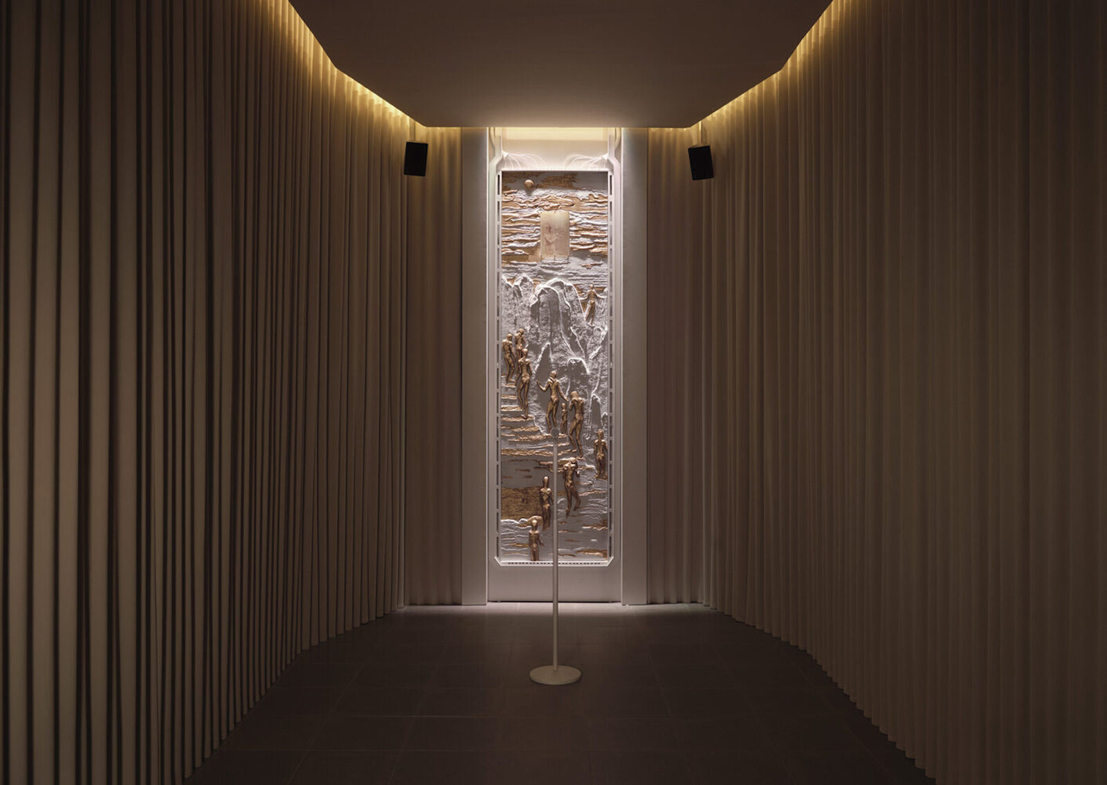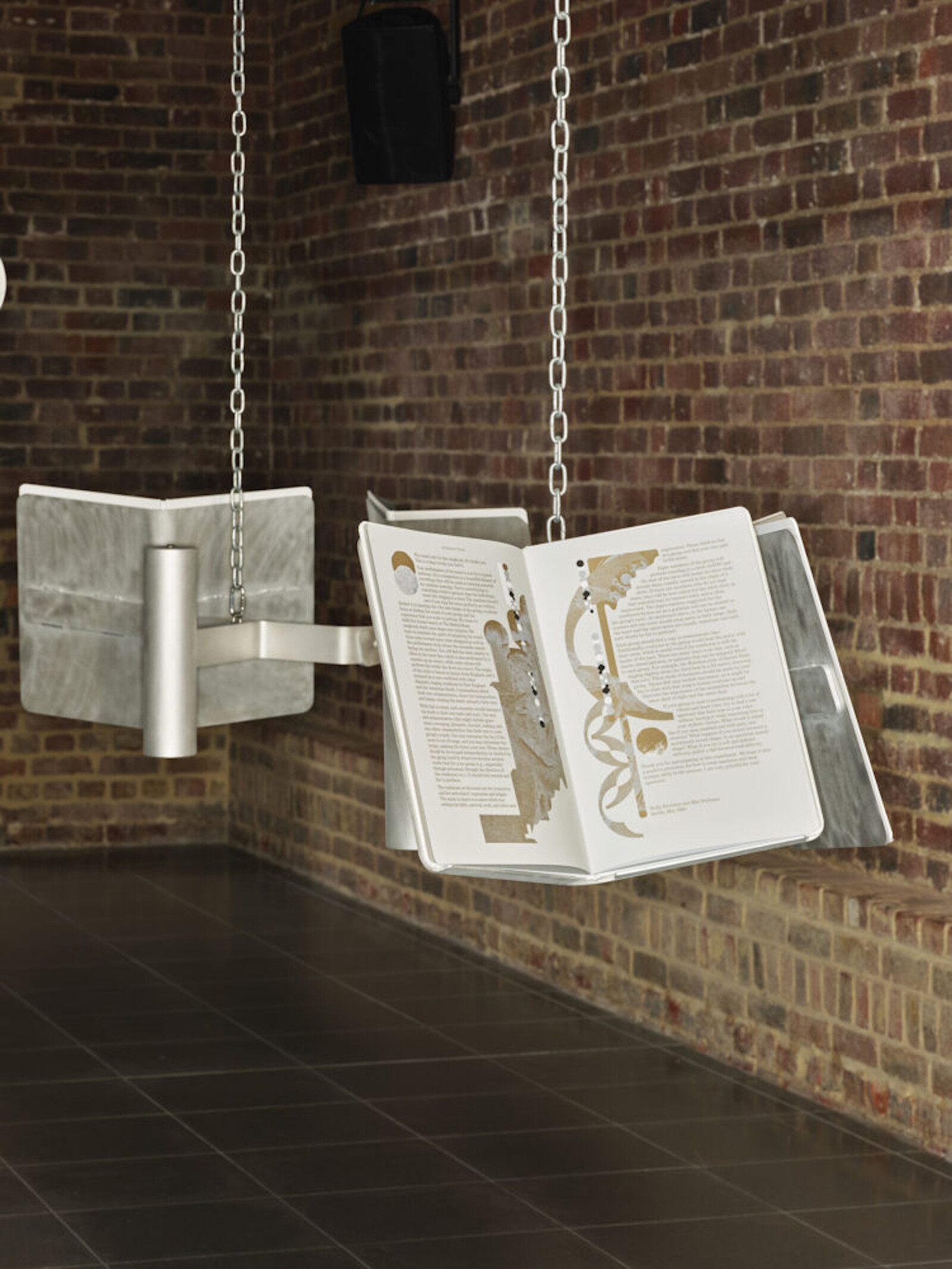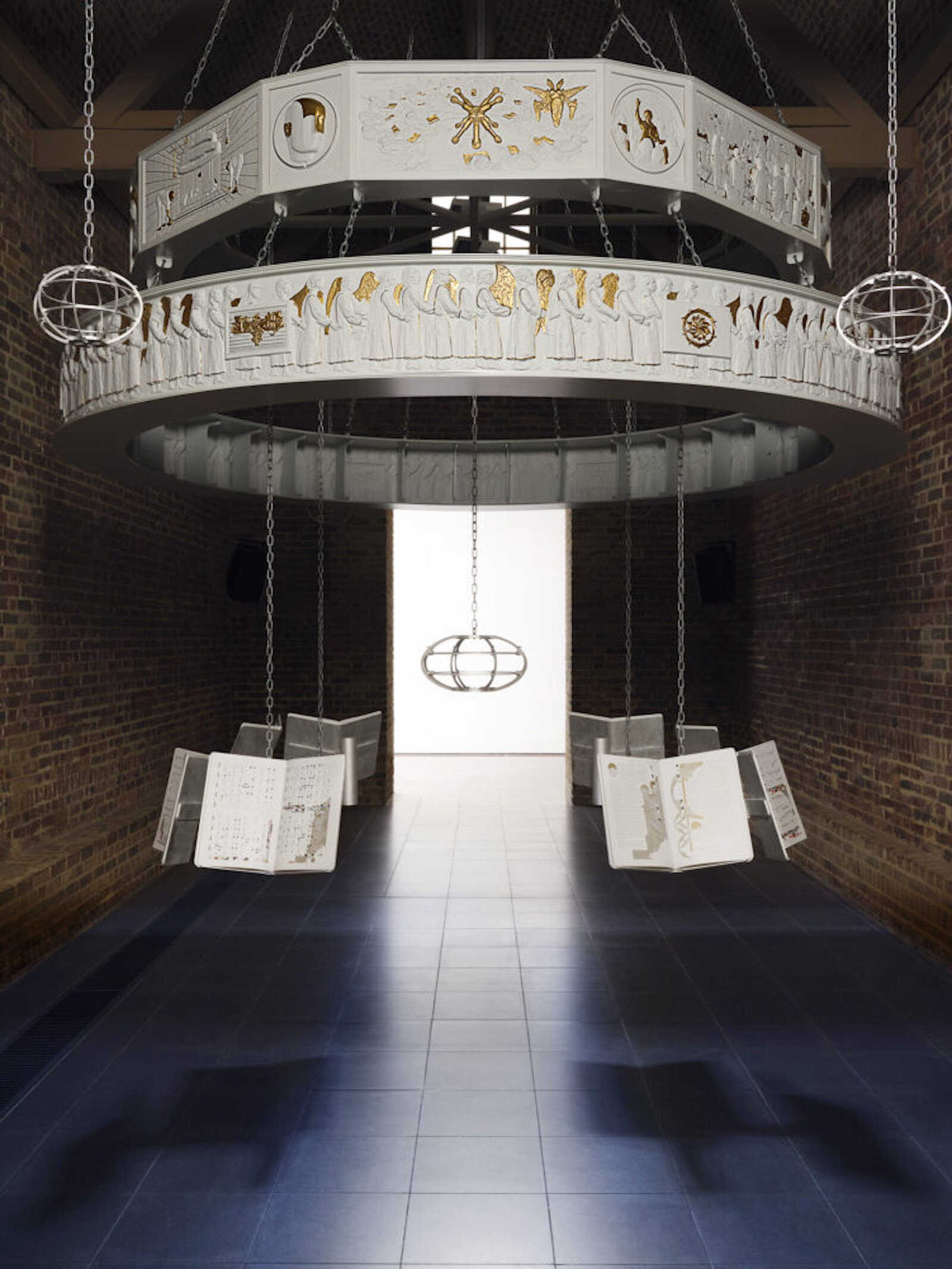 Sub, a group of architects best known for their set design collaborations with Balenciaga and Travis Scott, are responsible for the show’s sculptural moments. The songbooks that hang from The Wheel, meanwhile, are designed by the artists’ frequent graphic design collaborator, Michael Oswell. With their flashes of color, unusual scoring symbols, and unfurling geometric patterns, they are at once glitchy and Gregorian. The white circular two-tiered hanging object is completed with brass gilded panels depicting scenes and iconography from the choirs’ recording process, as well as more mythological embellishments, such as winged figures. Its steel structure, chain connections and the finely detailed panels give the piece a solidity, even an authenticity, which, combined with the songbooks, has a performative impact on the gallery itself. No longer just a container for the works, the room seems transformed by its hanging objects into an expectant place that awaits its next ensemble like an empty church; visually busy with its ornamental windows and friezes, but quiet and incomplete without its congregation.