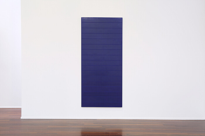 It was during this two-year period that the artist made Blue Premiss (1966), a large, vertical, rectangular painting that is the focal point of the first of two gallery spaces at Milani Gallery. Its under-layer is a slightly more purple in tone than International Klein Blue but has the same illusion of depth. Overtop, a series of horizontal strips approximately five inches wide are painted in a translucent film, forming murky bands of muddled and slightly reflective textures. Each stripe varies in its width, creating an unstable surface that fluctuates as you look up and down.